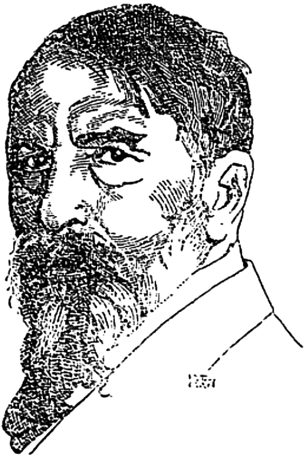 Van Dyke; gray blue eyes below gray brows and squinting lids: a gray mane combed from the right side
