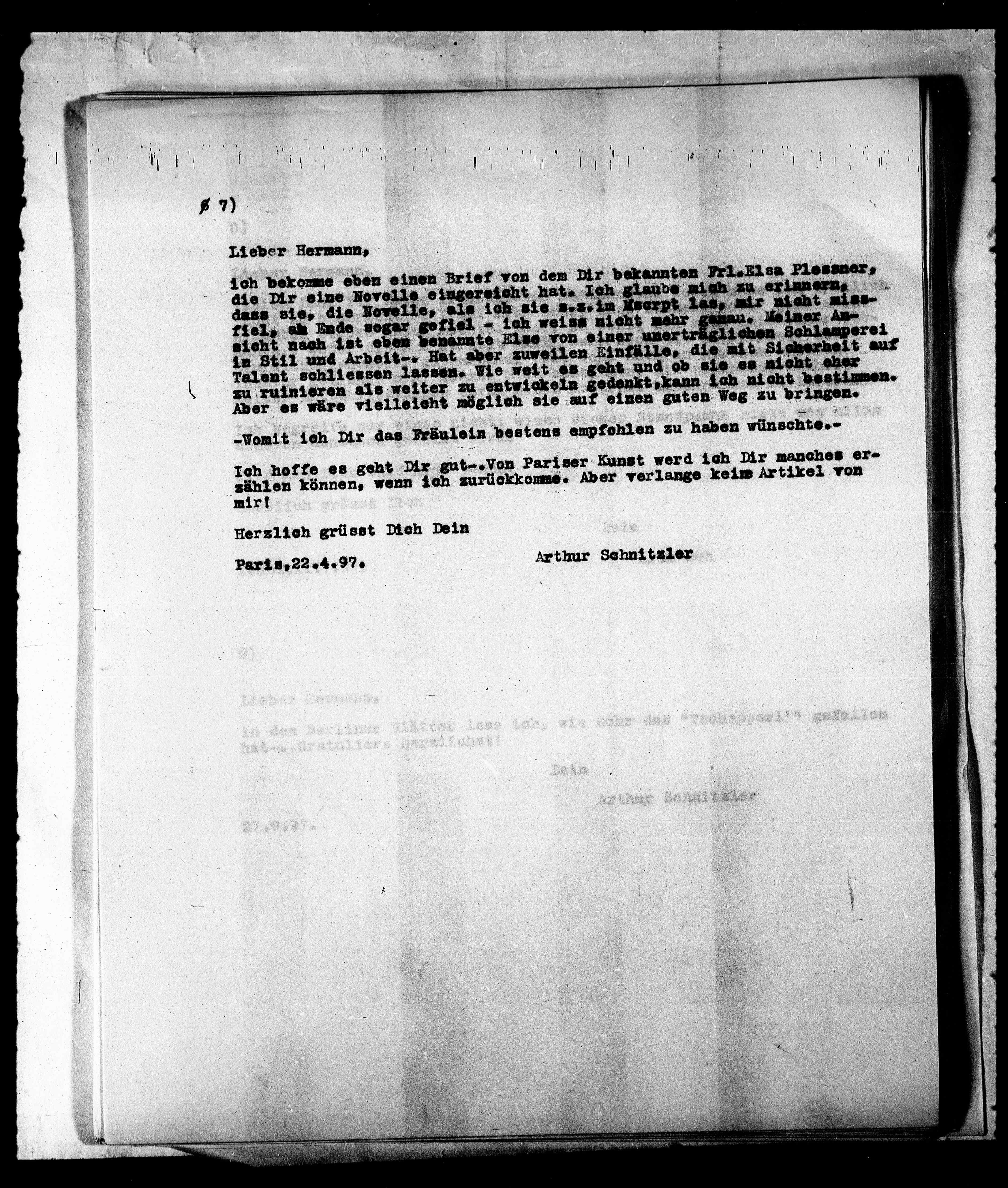 ich bekomme eben einen Brief von dem Dir bekannten Frl. Elsa Plessner,