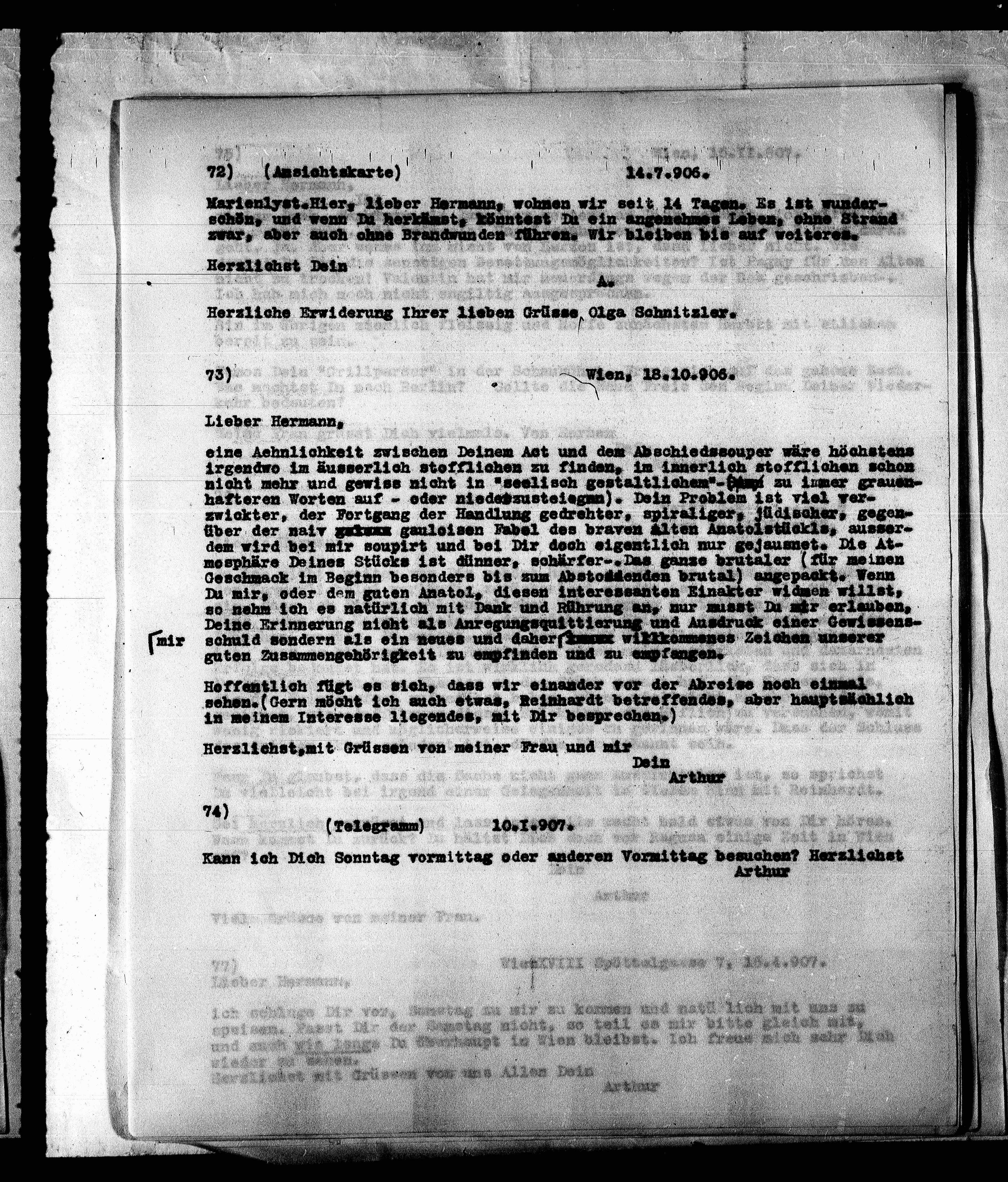 Herzliche Erwiderung Ihrer lieben Grüsse Olga Schnitzler.