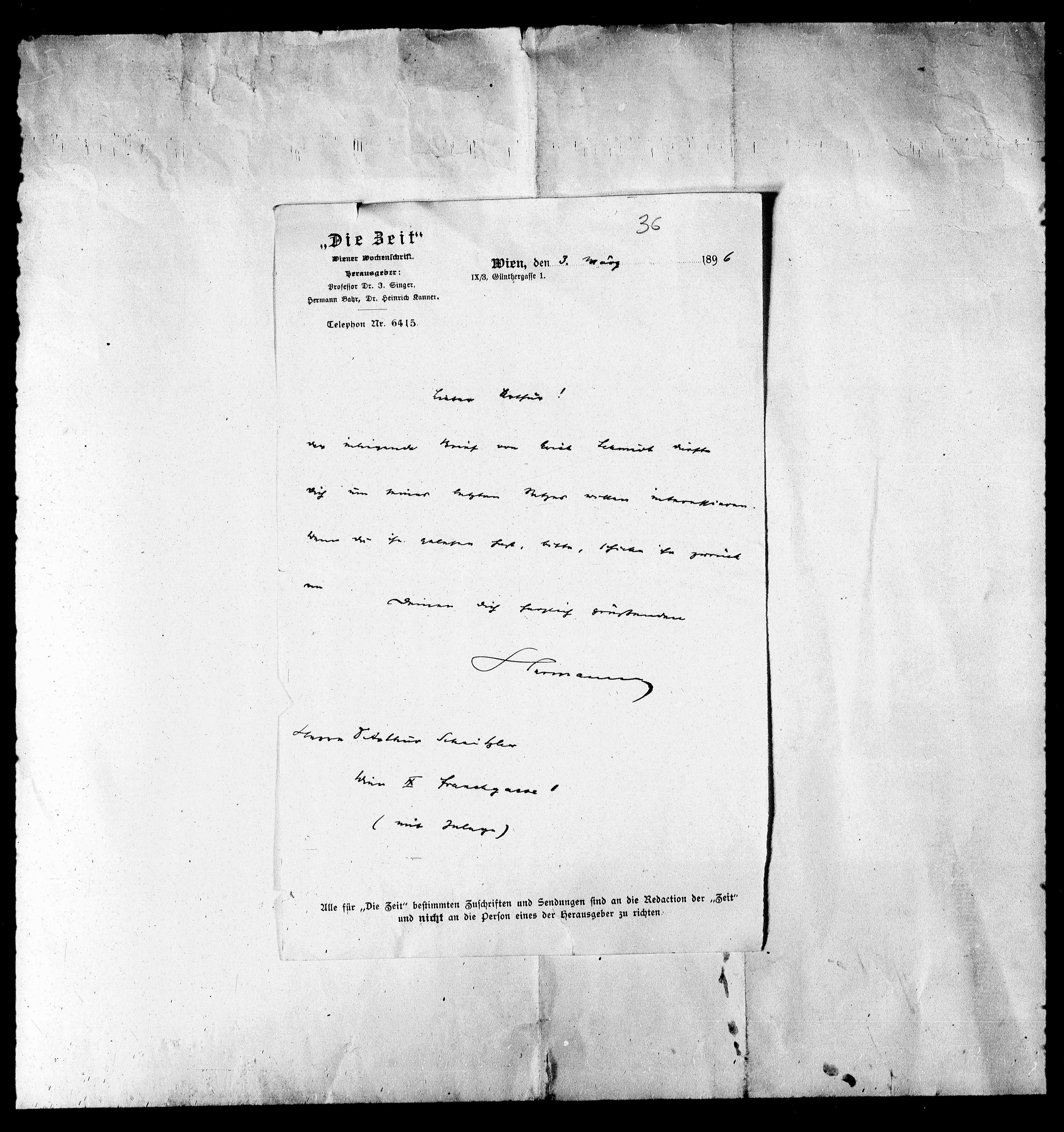Alle für „Die Zeit“ bestimmten Zuschriften und Sendungen sind an die Redaction der „Zeit“