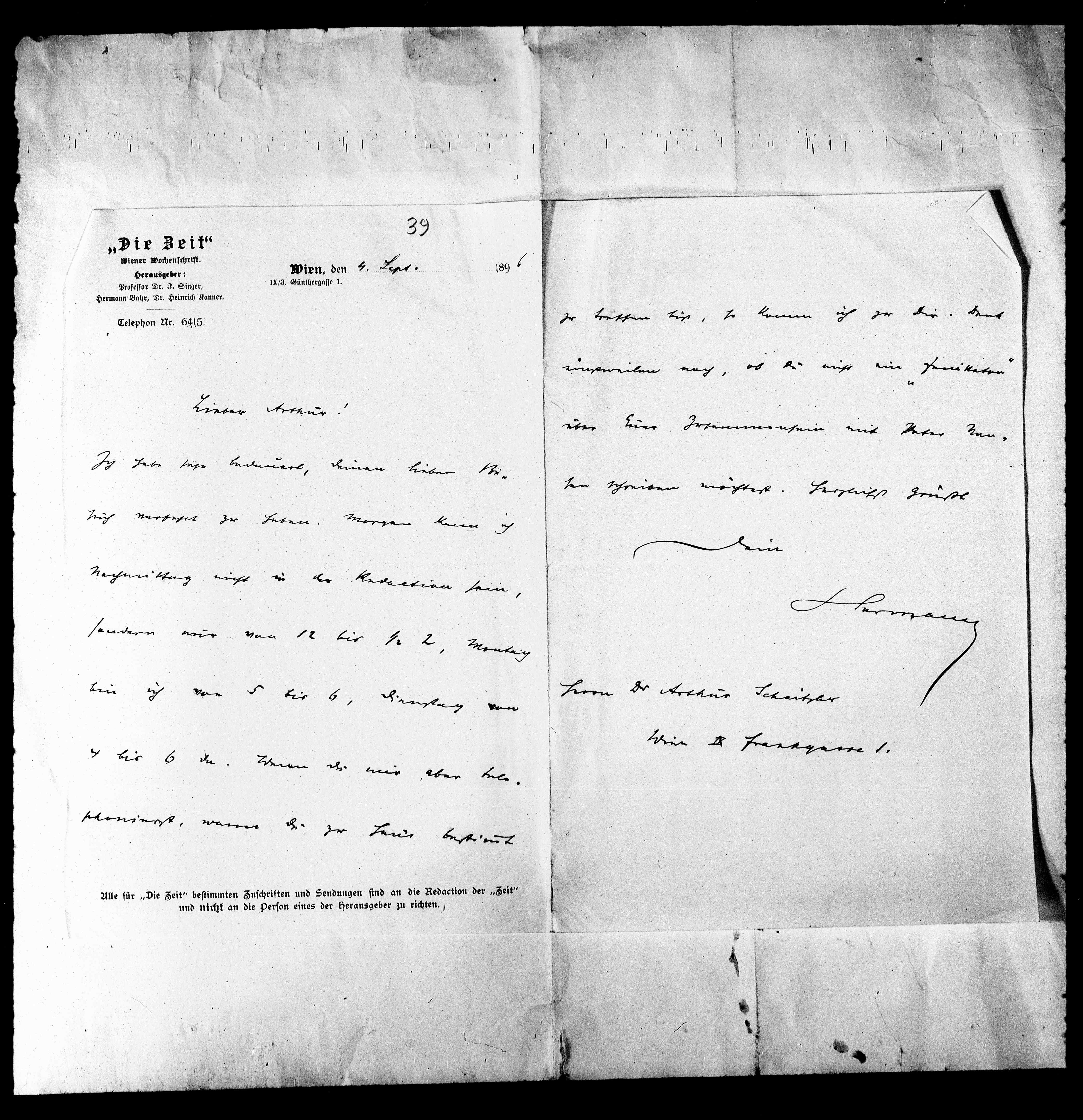 Alle für „Die Zeit“ bestimmten Zuschriften und Sendungen sind an die Redaction der „Zeit“