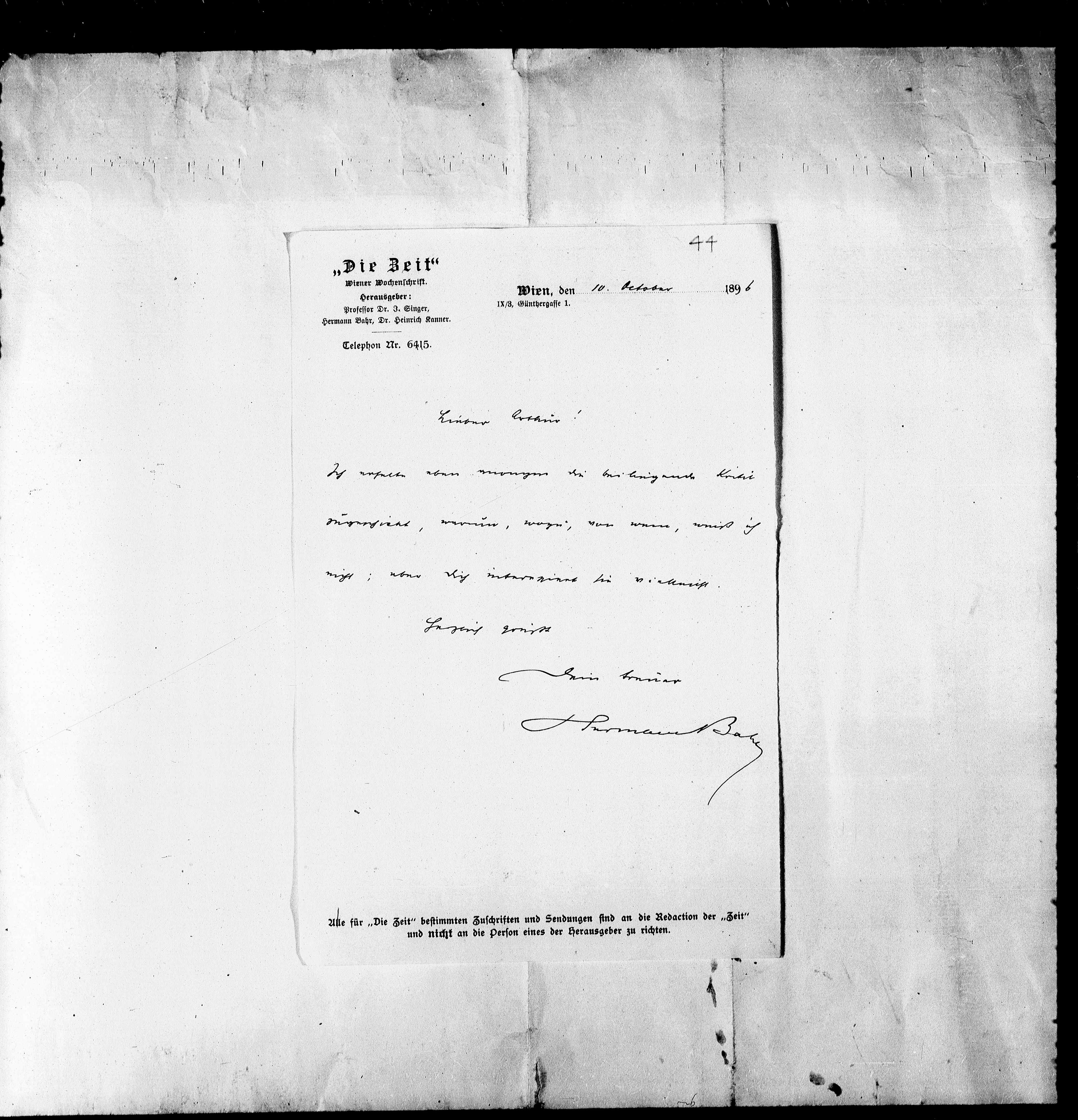 Alle für „Die Zeit“ bestimmten Zuschriften und Sendungen sind an die Redaction der „Zeit“