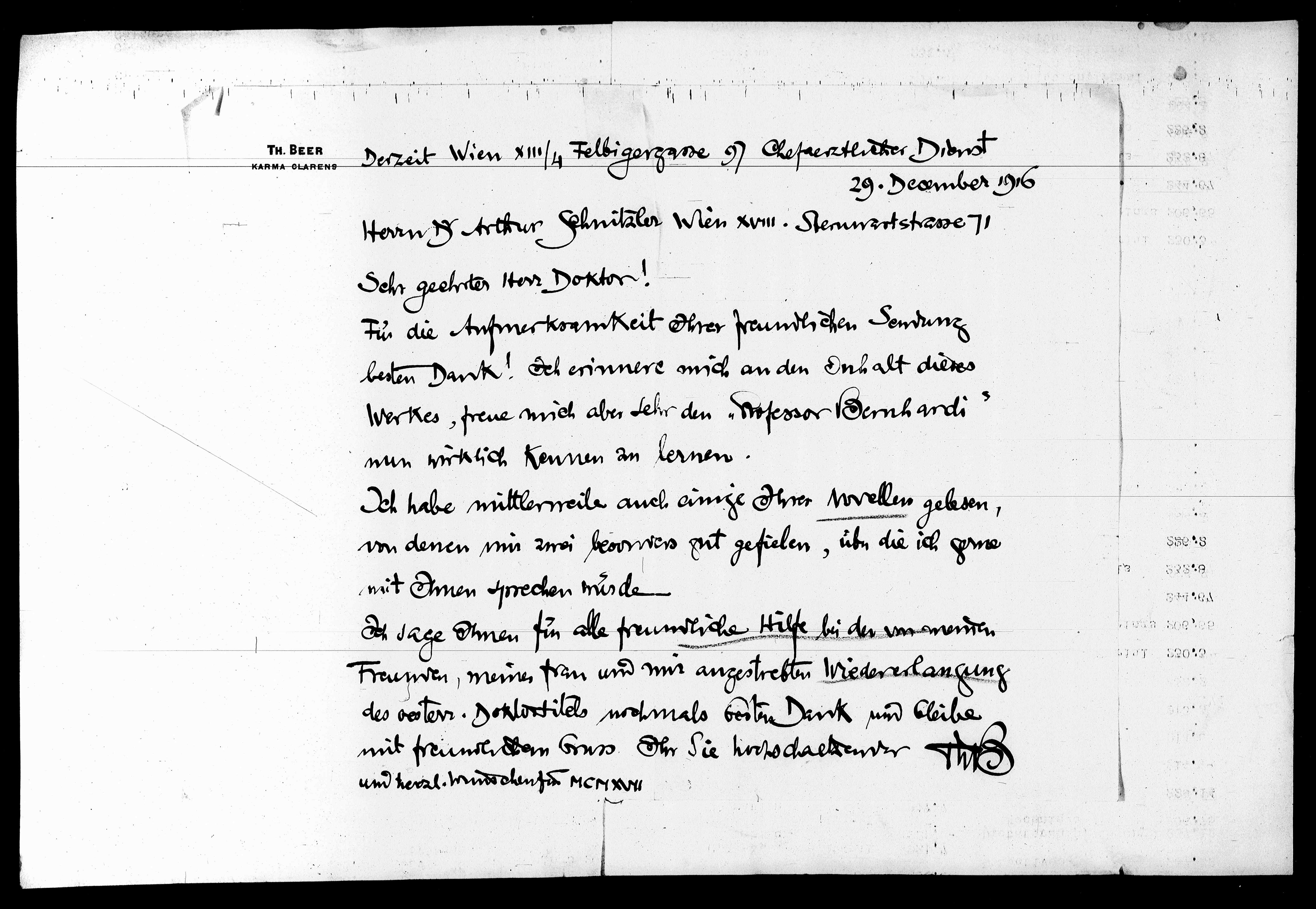 Herrn & Arthur Schnitzler Wien XVIII. Sternwartstraße 71
