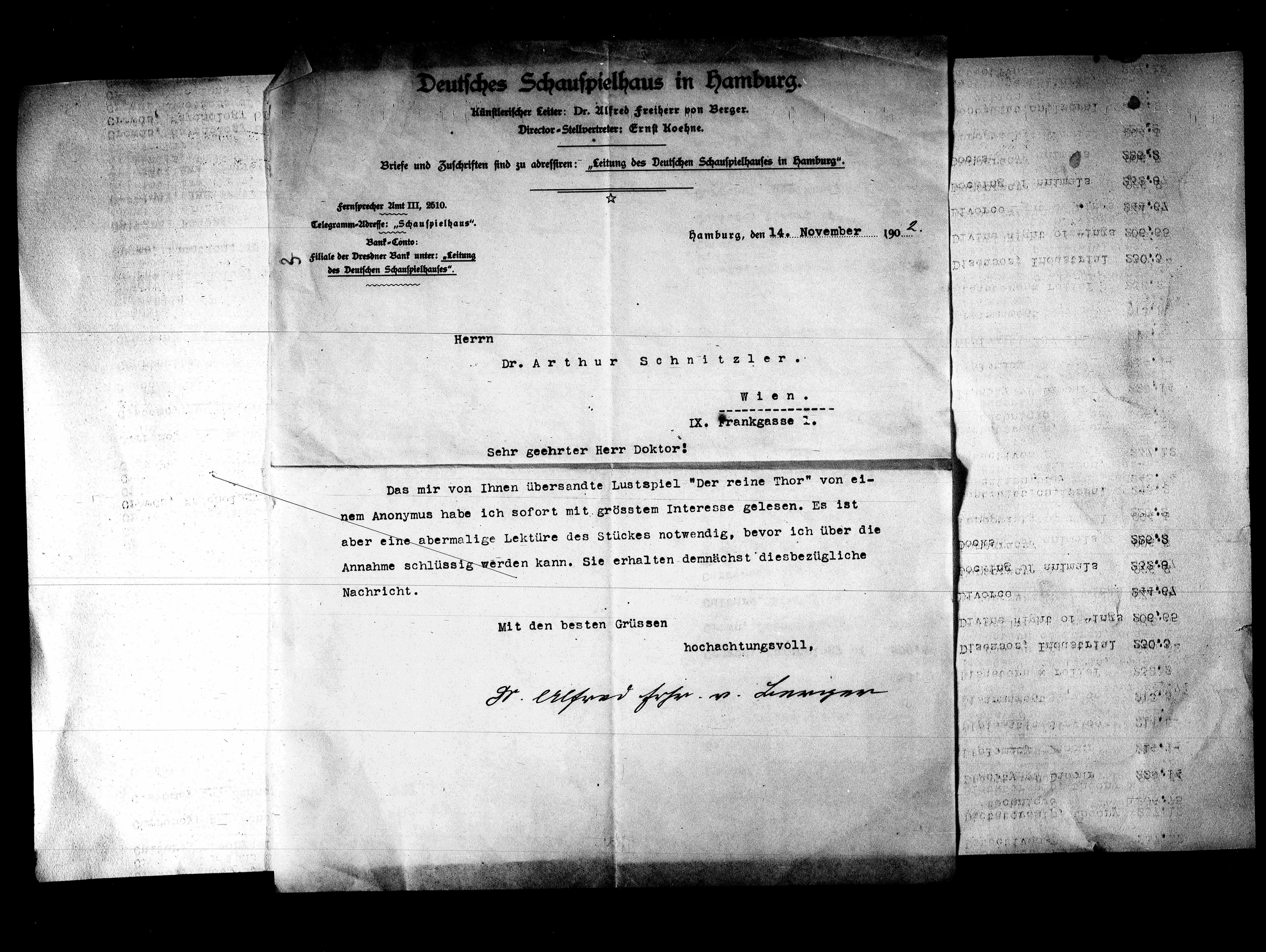 Briefe und Zuschriften sind zu adressiren: „Leitung des Deutschen Schauspielhauses in Hamburg“.