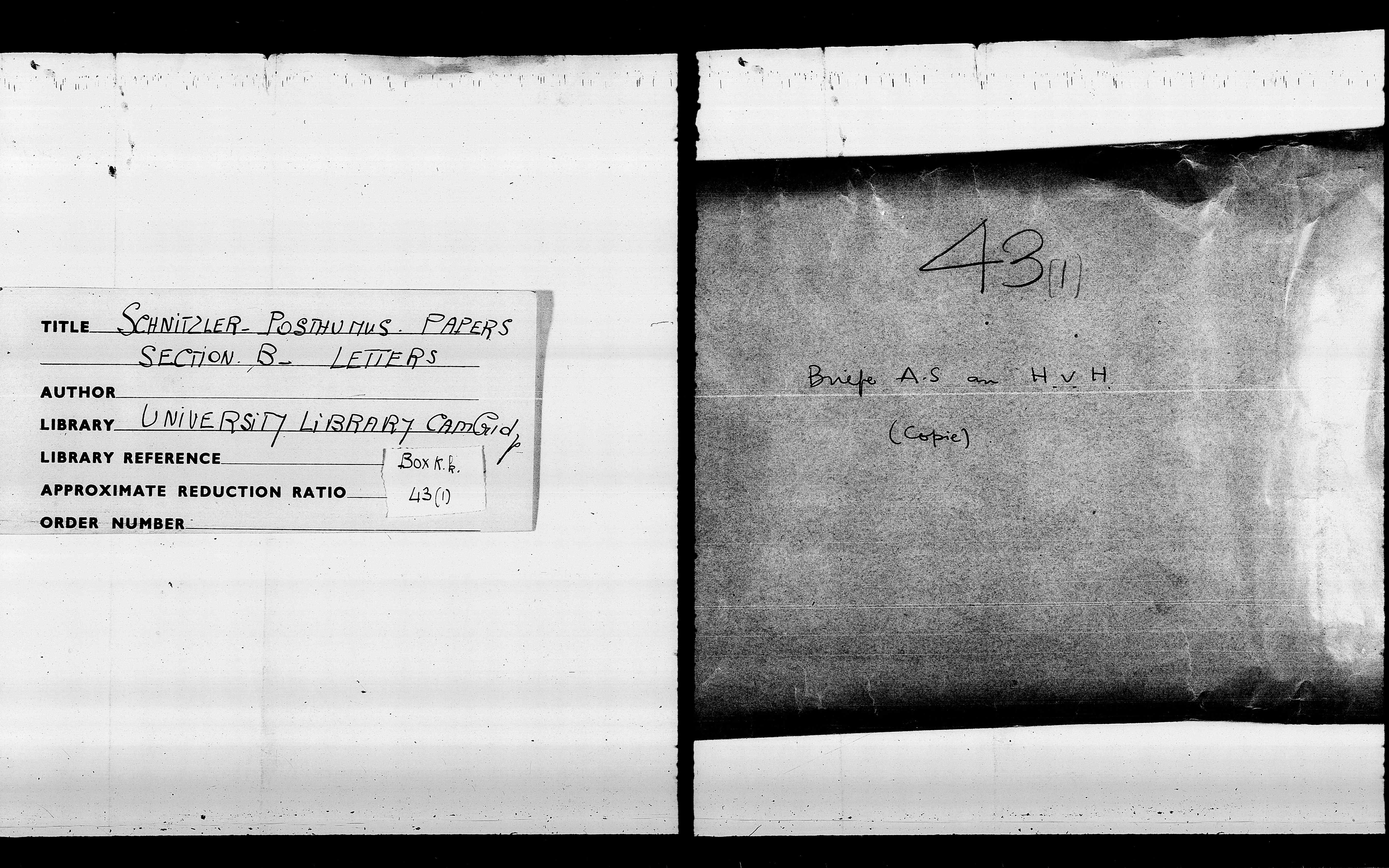 B43: Hofmannsthal, Hugo von_1 an HvH, Abschrift, Seite 1, in: Mikroverfilmung des Cambridger Nachlasses. Hg. Peter Andorfer, Martin Anton Müller und Laura Untner, Austrian Centre for Digital Humanities and Cultural Heritage, Wien 2024, https://schnitzler-mikrofilme.acdh.oeaw.ac.at/1416436_0001.html
