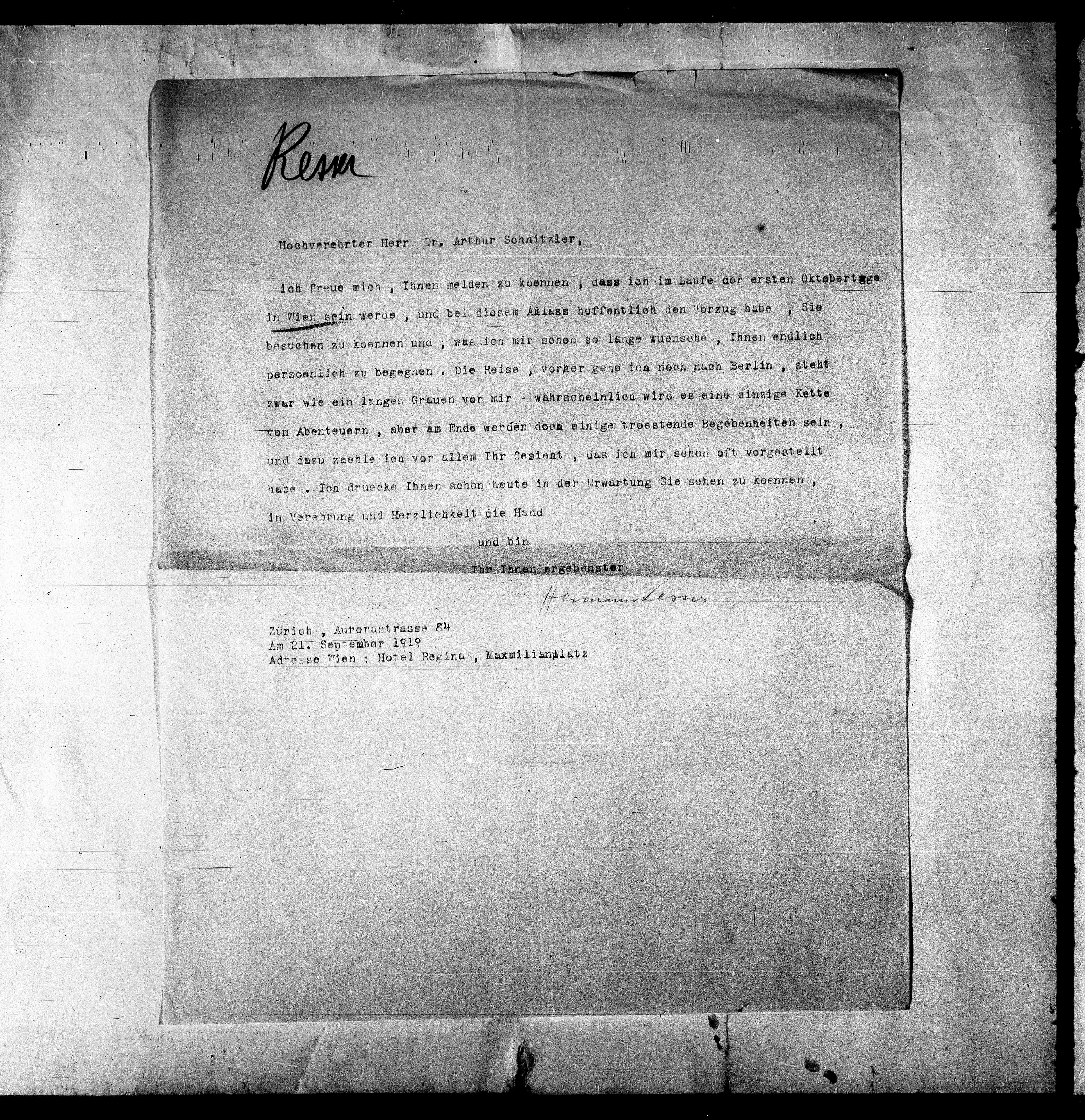 Hochverehrter Herr Dr. Arthur Schnitzler,