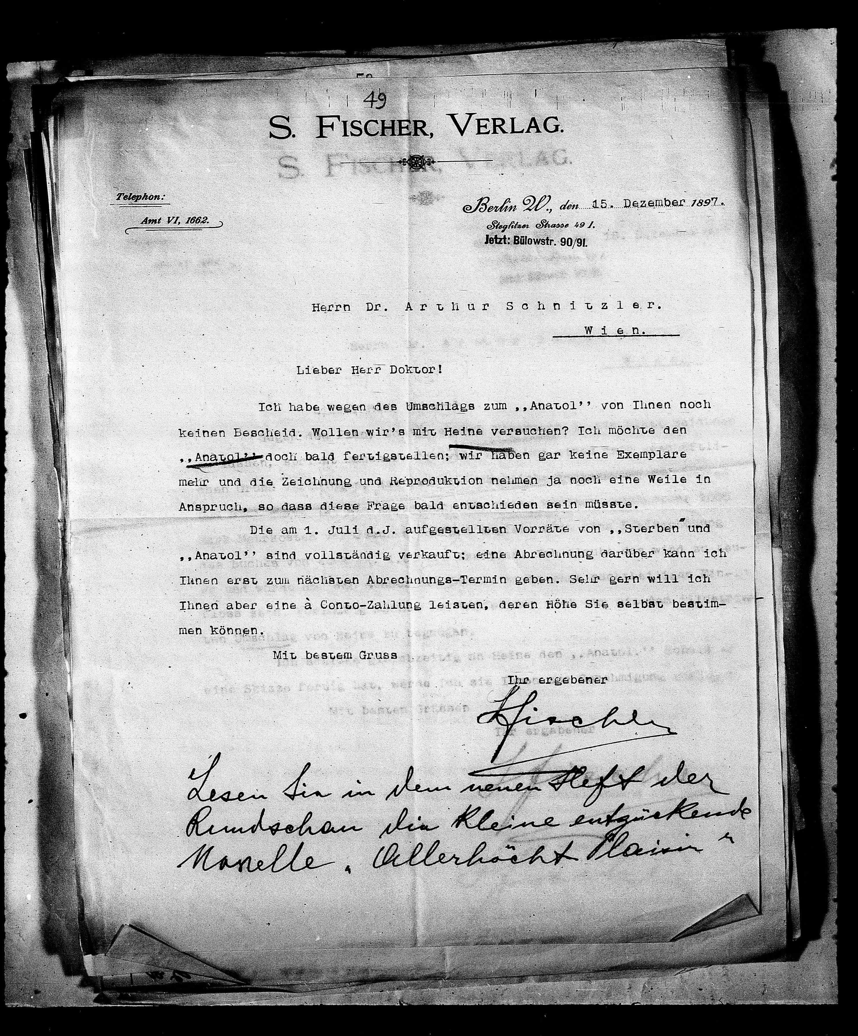 Ich habe wegen des Umschlags zum „Anatol“ von Ihnen noch