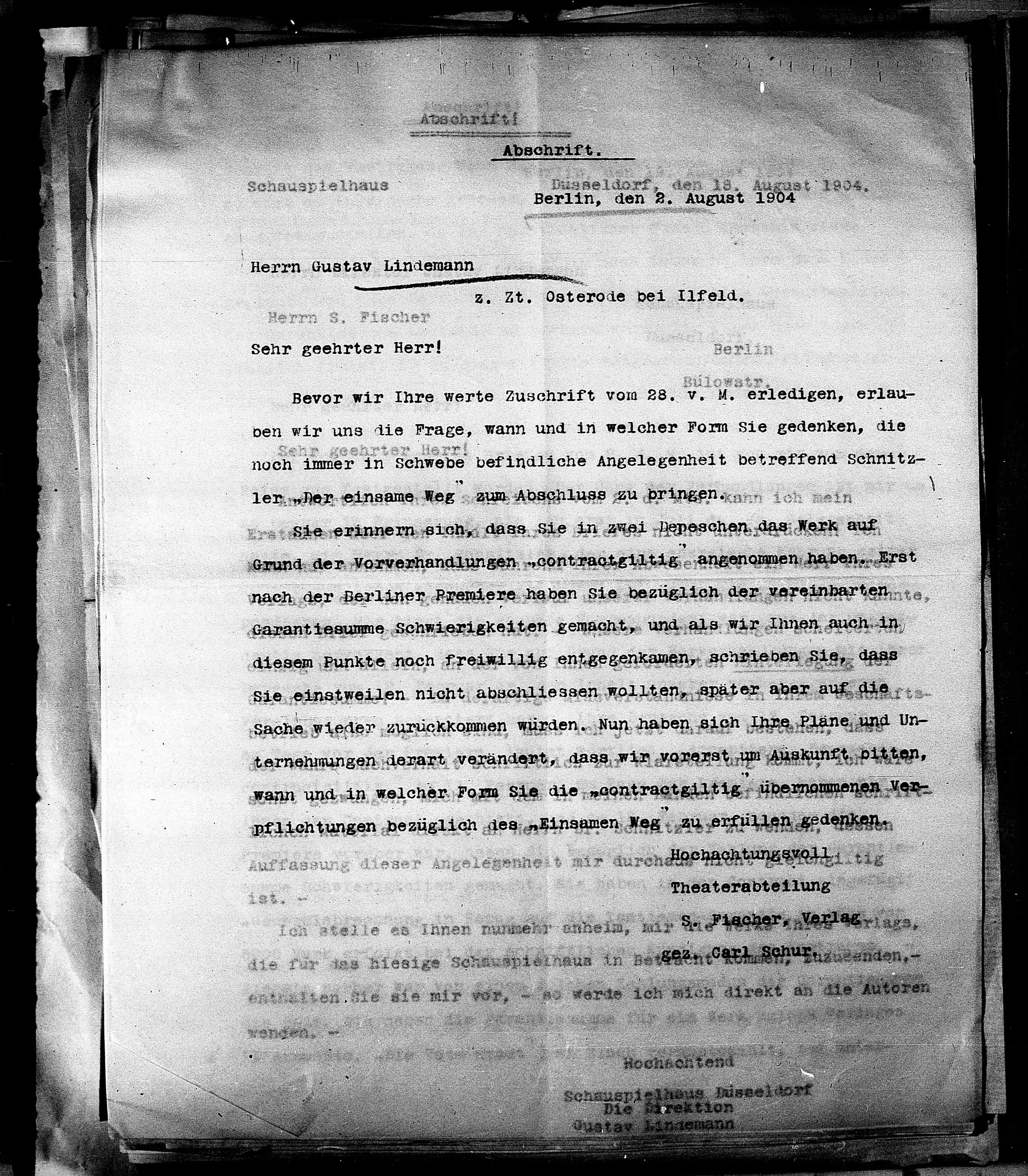 hiesige Schauspielhaus in Be gez. Carl Schur.zusenden,