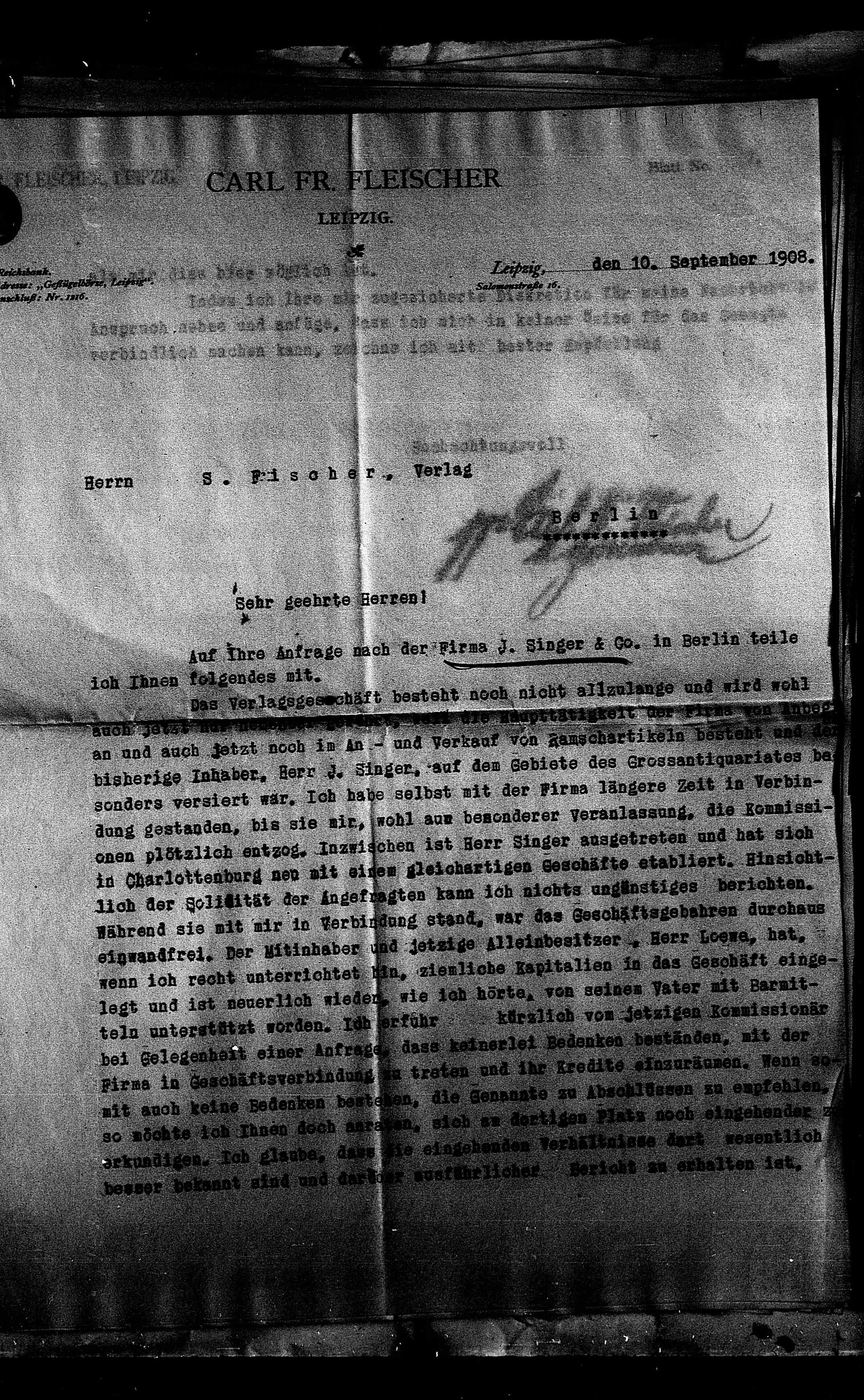 Auf Ihre Anfrage nach der Firma J. Singer & Co. in Berlin teile