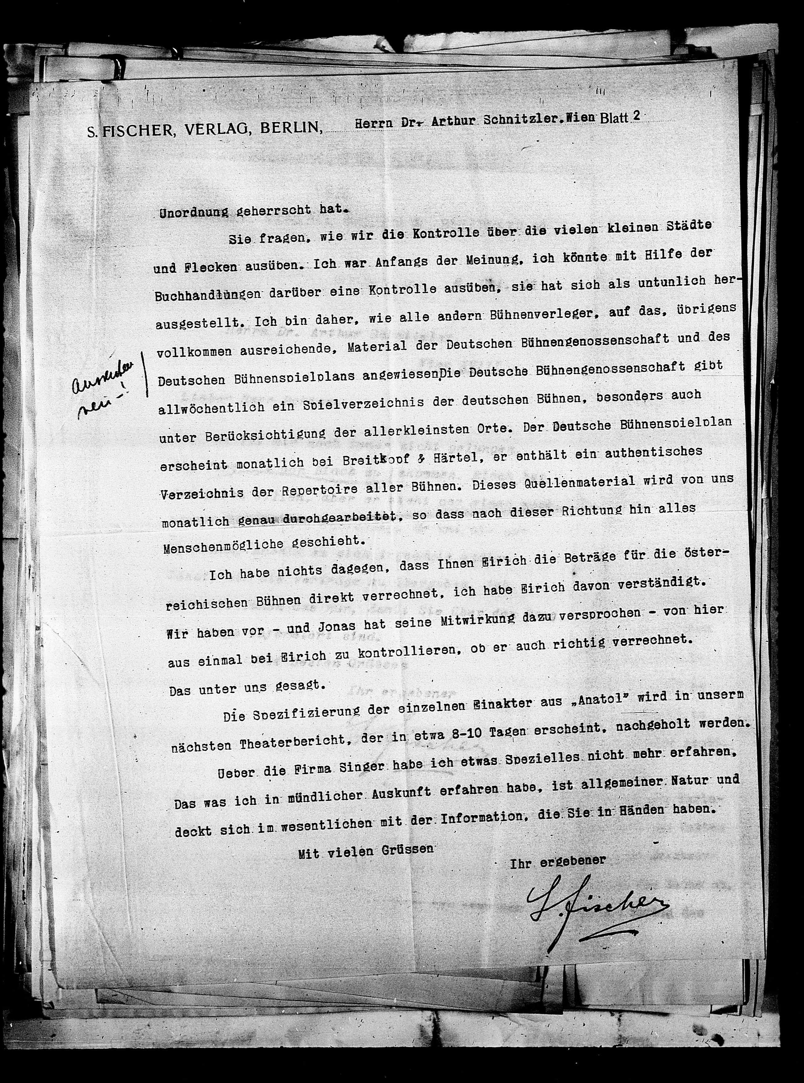 S. FISCHER, VERLAG, BERLIN. Herrn Dr- Arthur Schnitzler. Nien Blatt 2