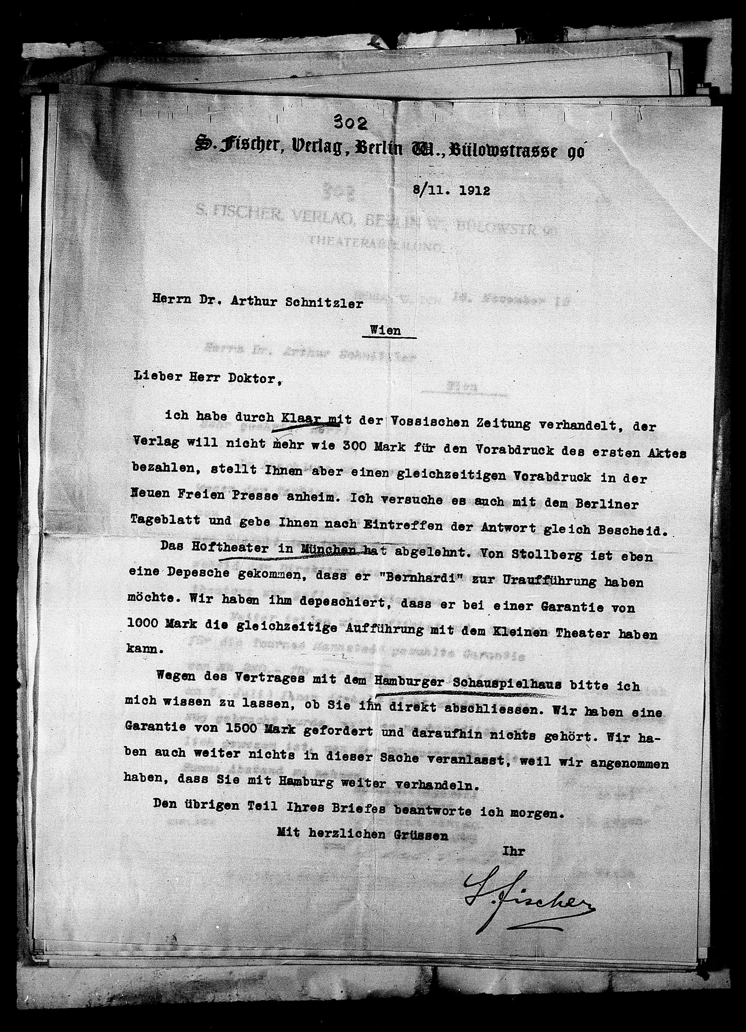 Verlag will nicht mehr wie 300 Mark für den Vorabdruck des ersten Aktes