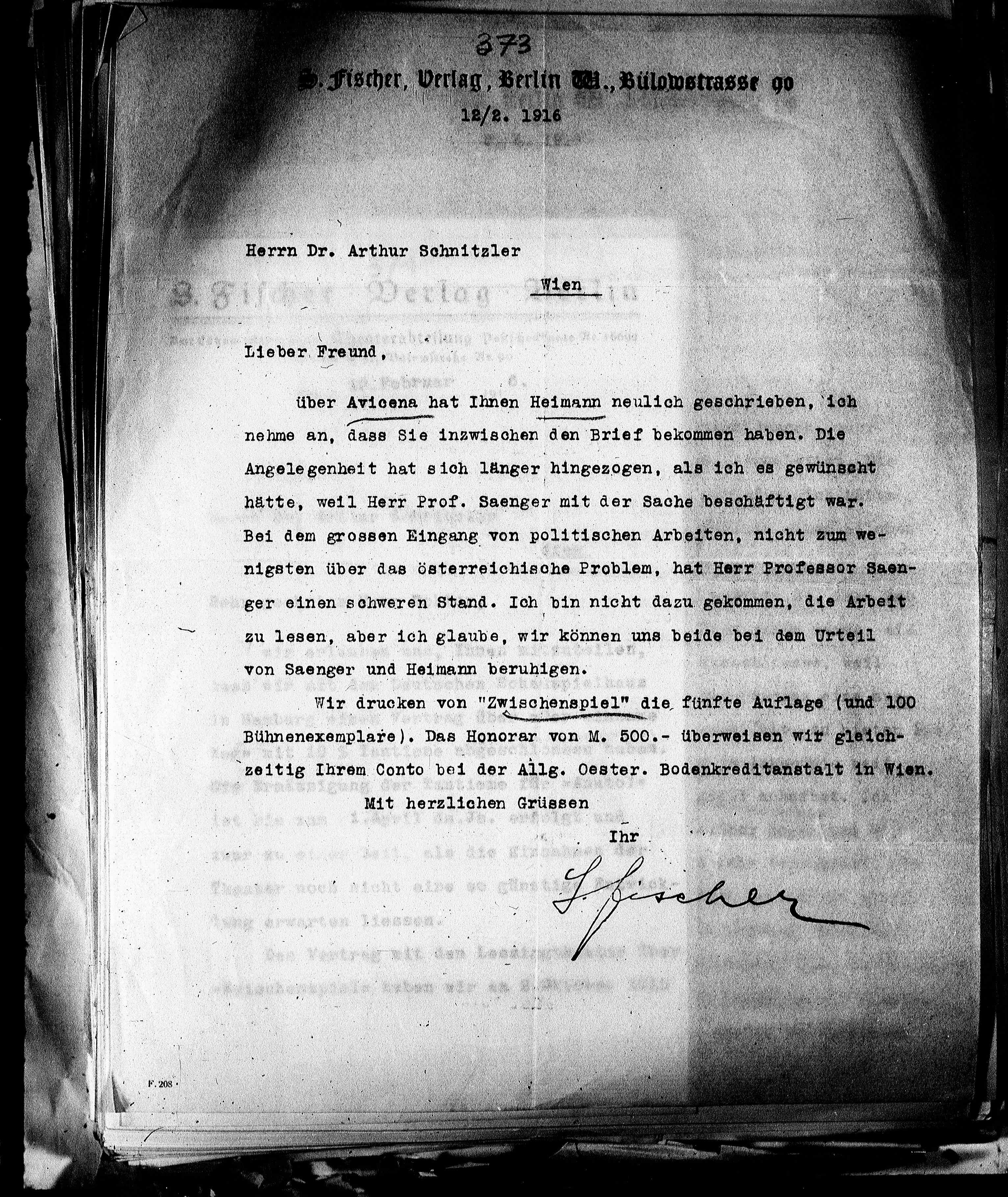 Bühnenexemplare). Das Honorar von M. 500.- überweisen wir gleich