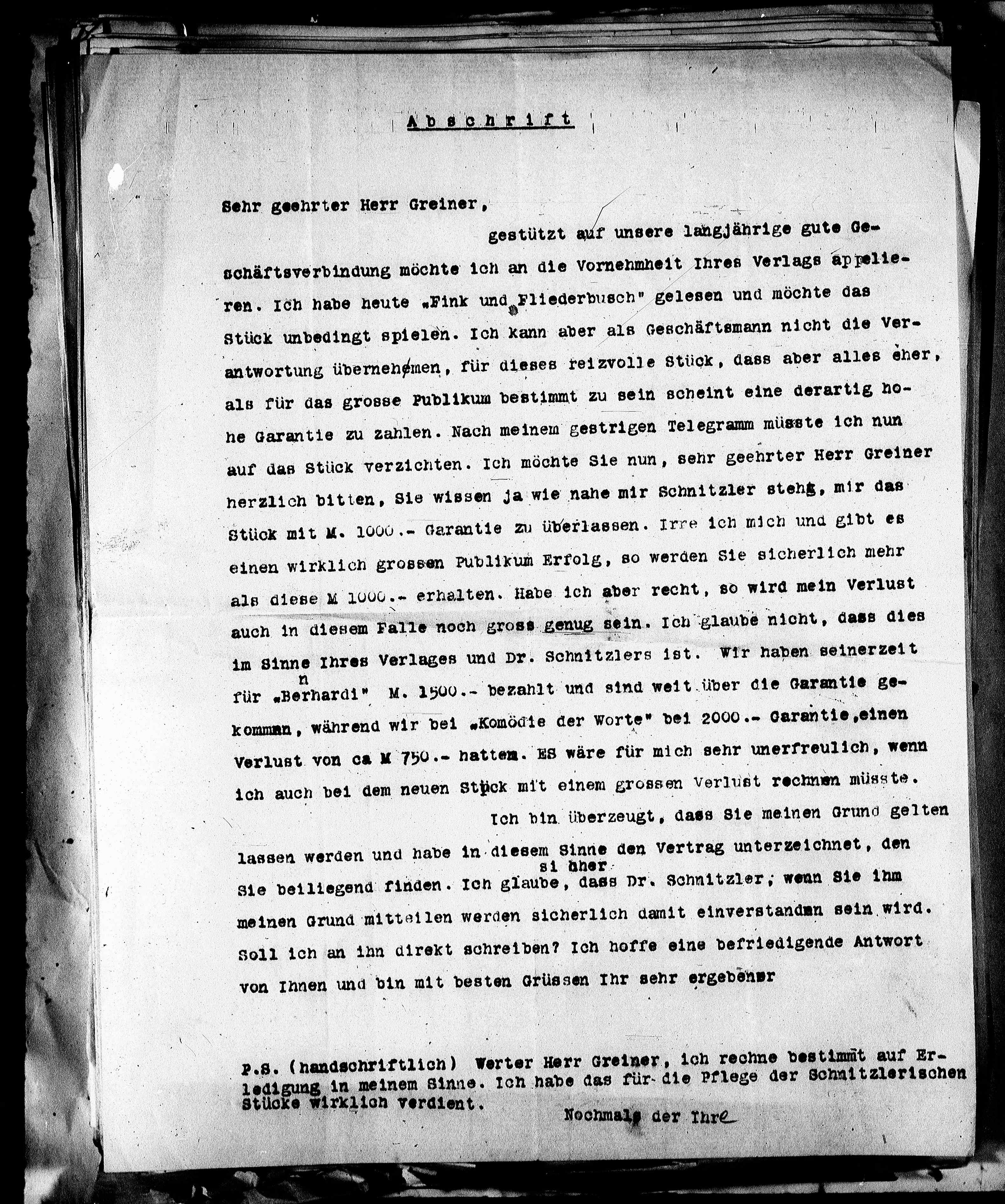 im Sinne Ihres Verlages und Dr. Schnitzlers ist. Wir haben seinerzeit