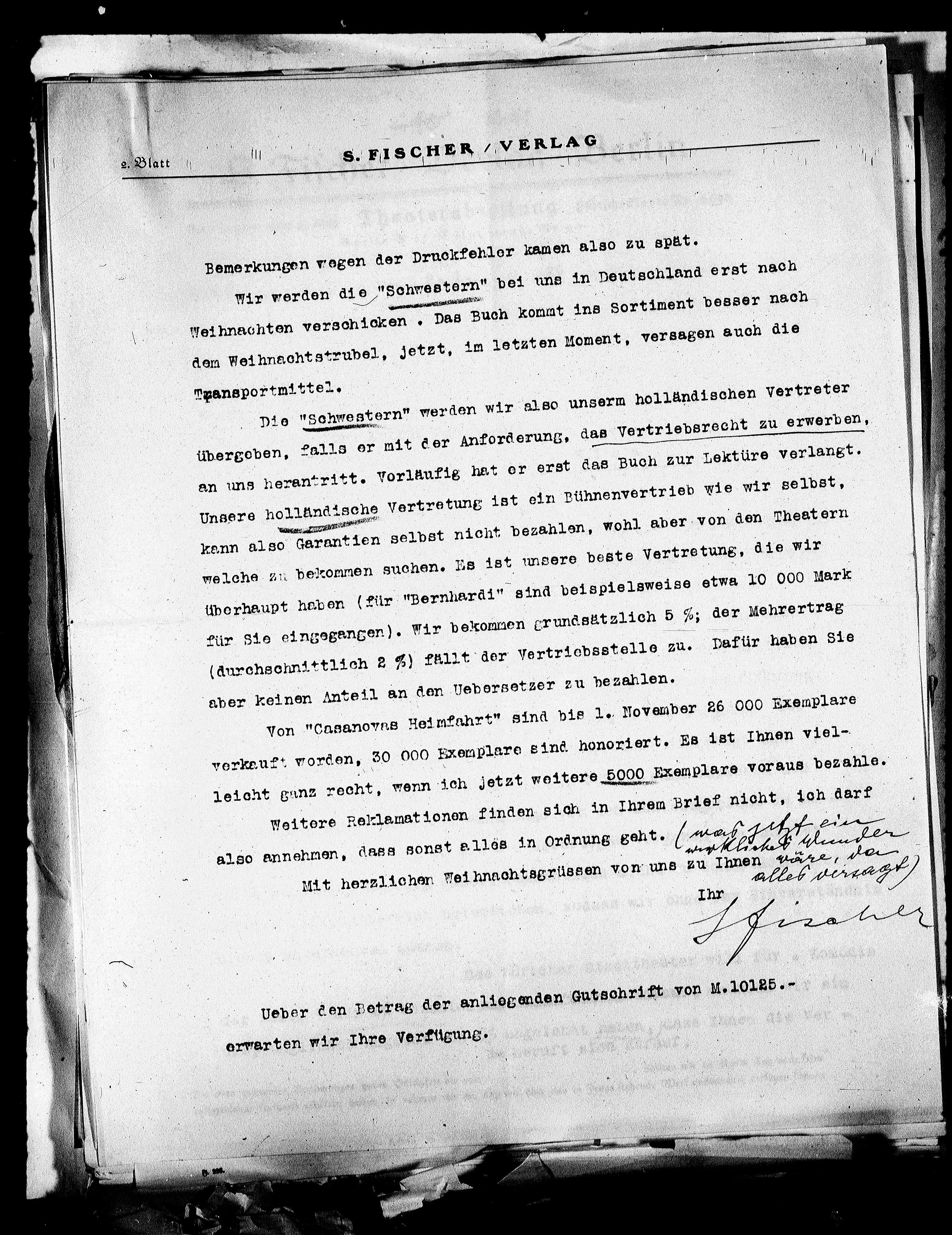 Ueber den Betrag der anliegenden Gutschrift von M. 10125.-