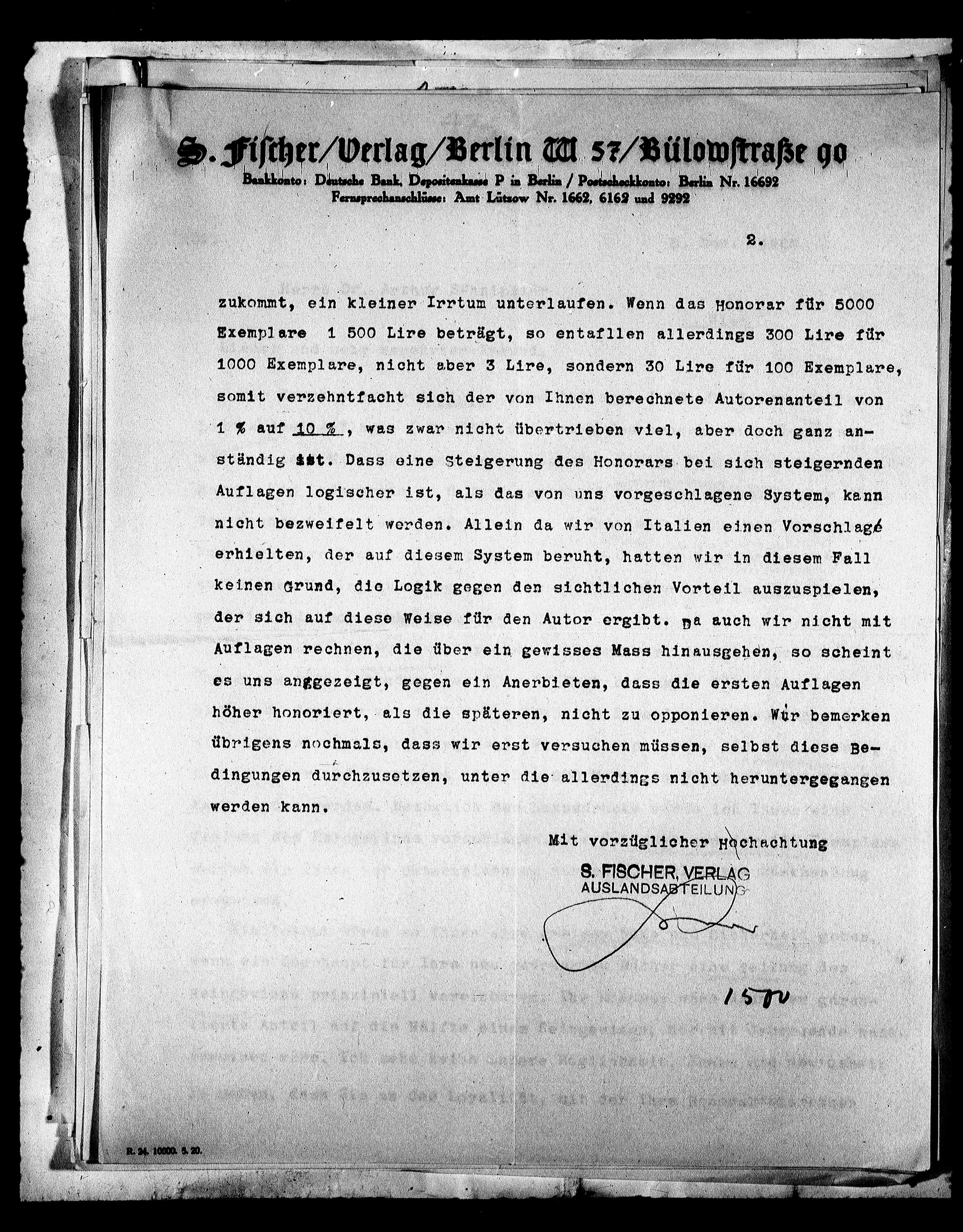S. Fischer/Verlag/Berlin M 57/Bülowstrasse 90