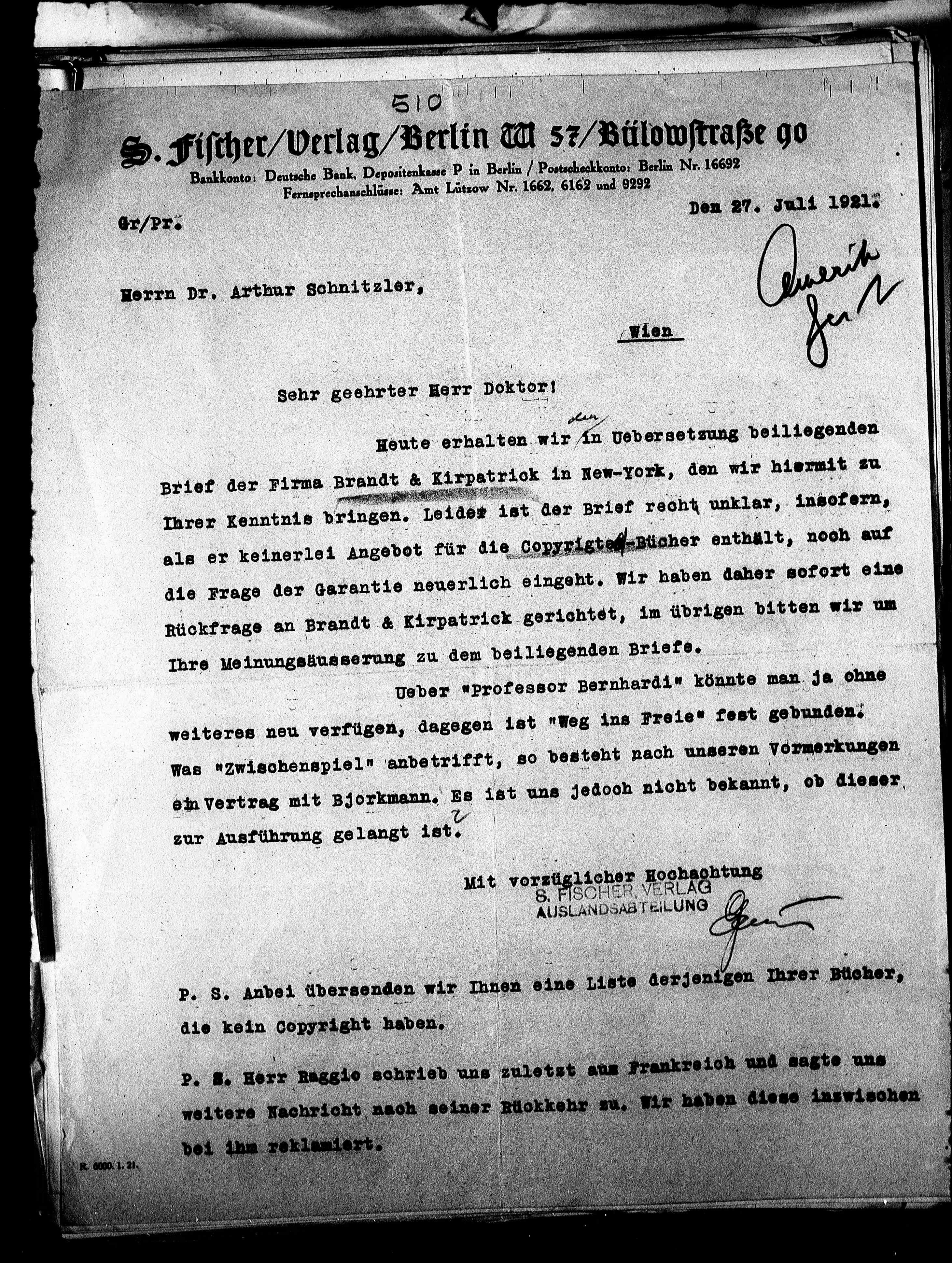 S. Fischer/Verlag/Berlin W 57/Bülowstraße 9o