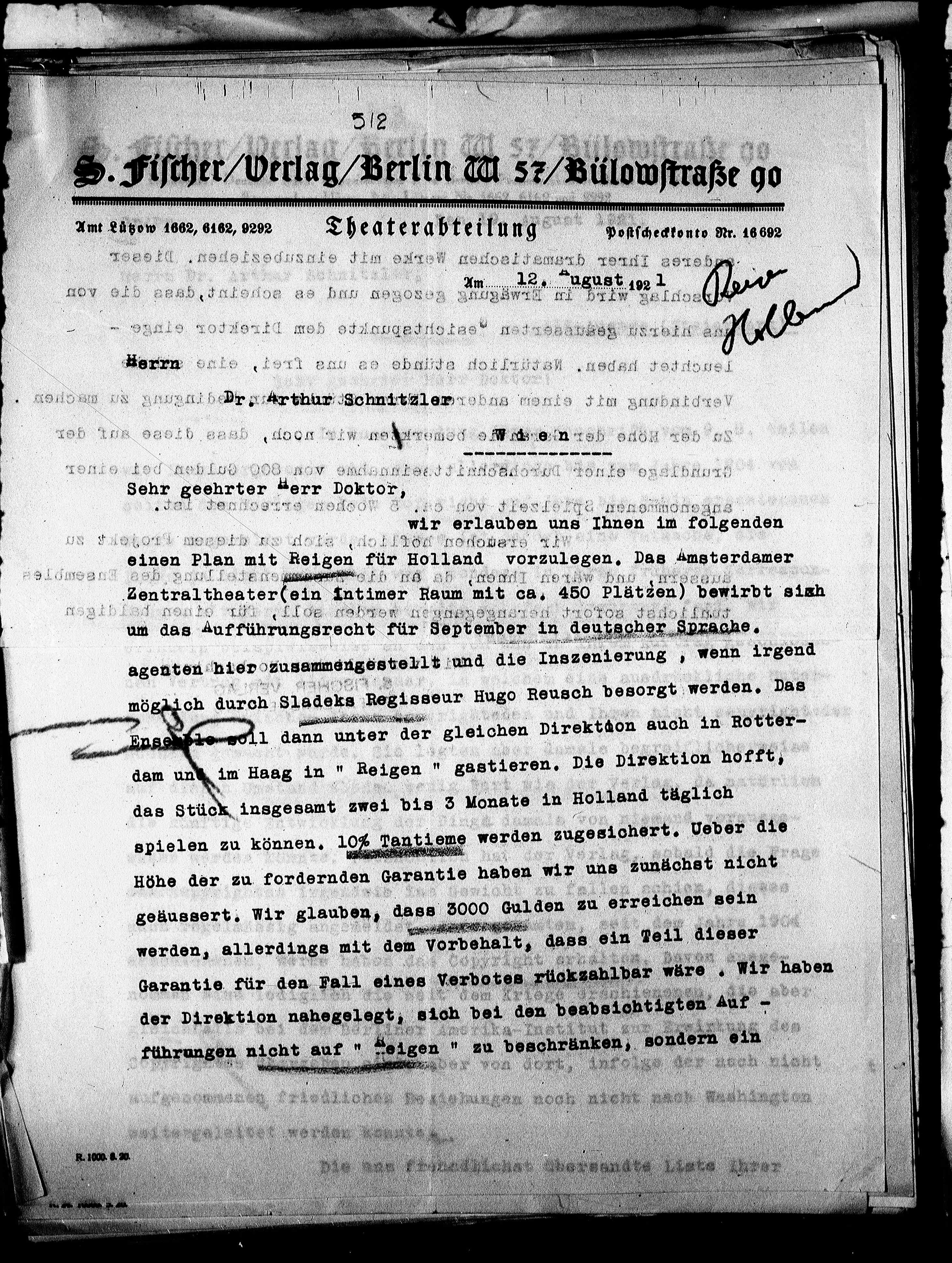 S. Fischer/Verlag/Berlin W 57/Bülowstraße 9o