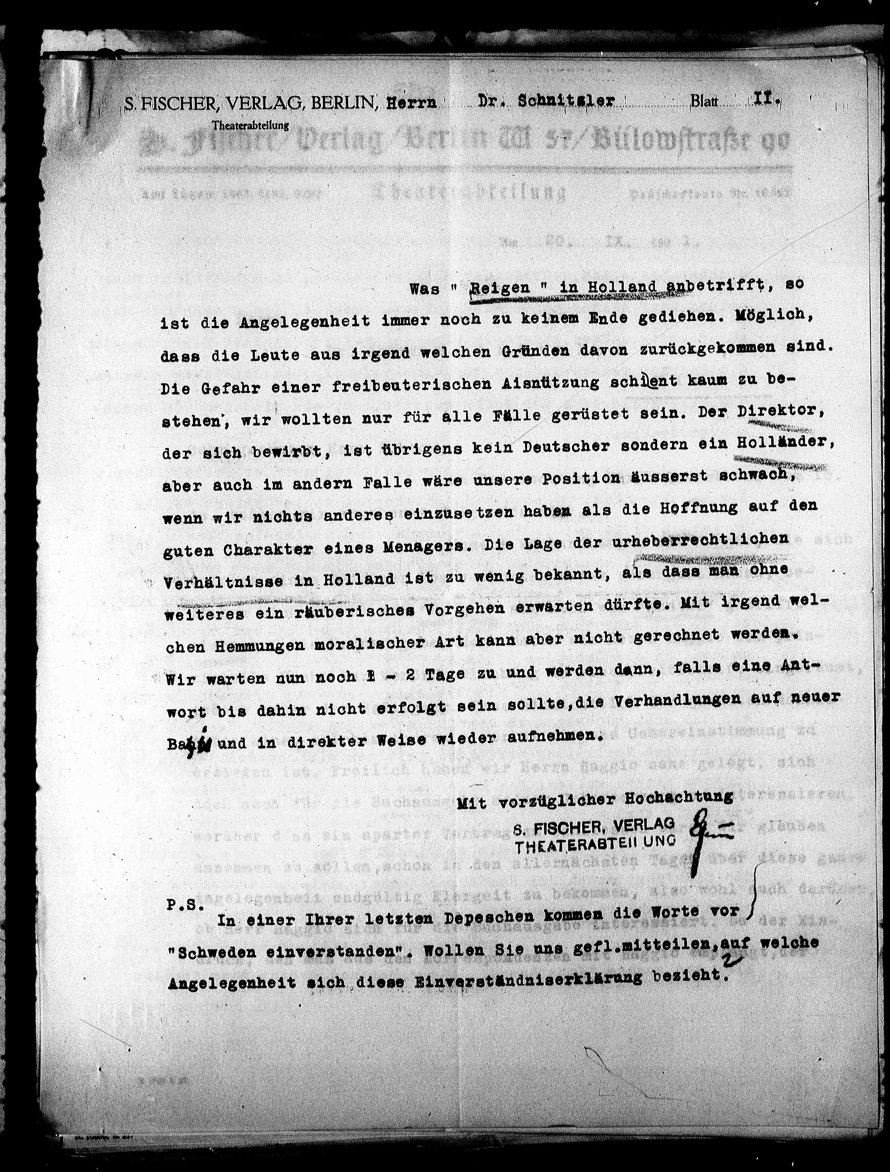 S. FISCHER,VERLAG, BERLIN, Herrn Dr. Schnitsler Blatt II.