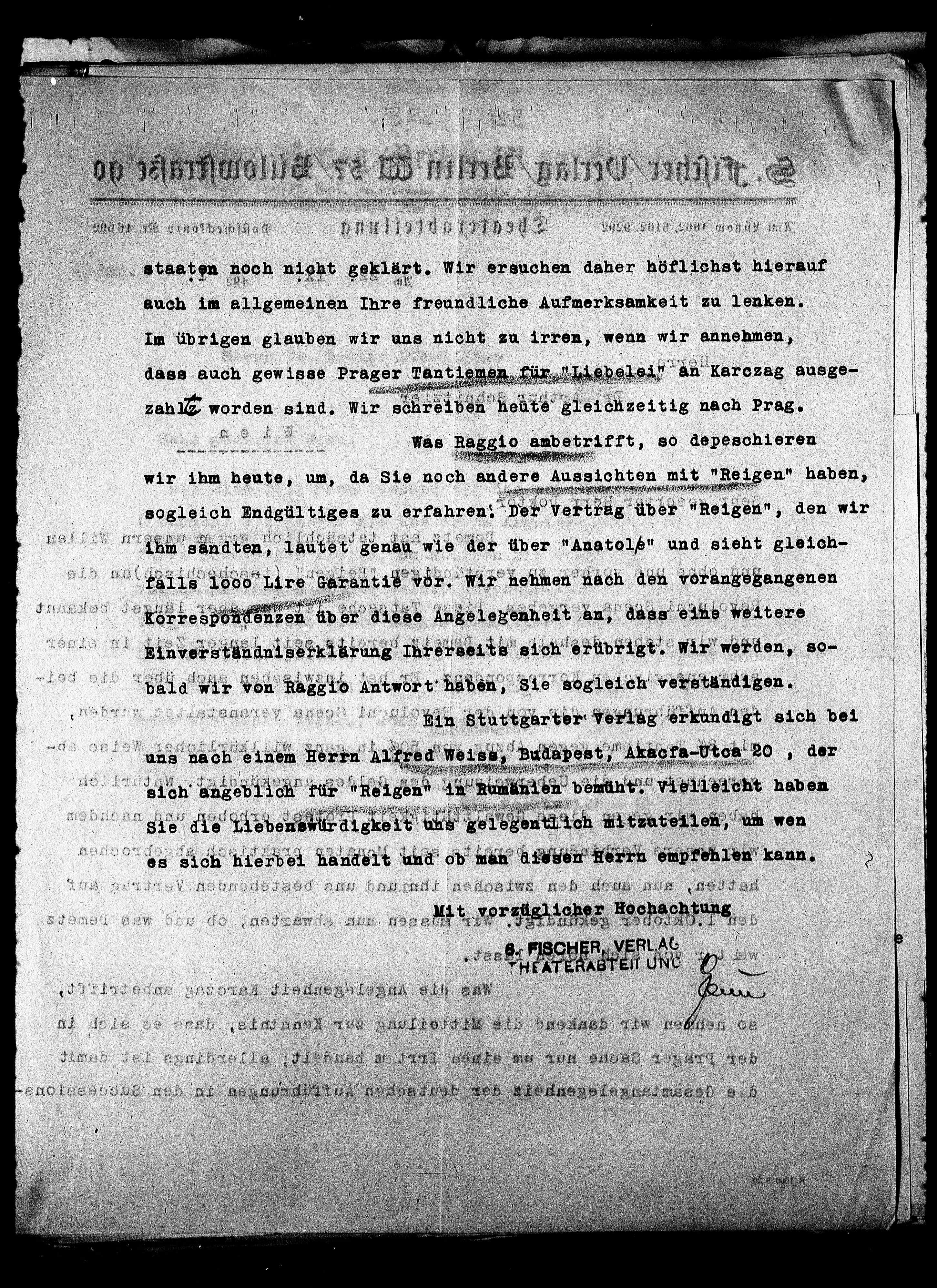 dass auch gewisse Prager Tantiemen für "Liebelei" an Karczag ausge-