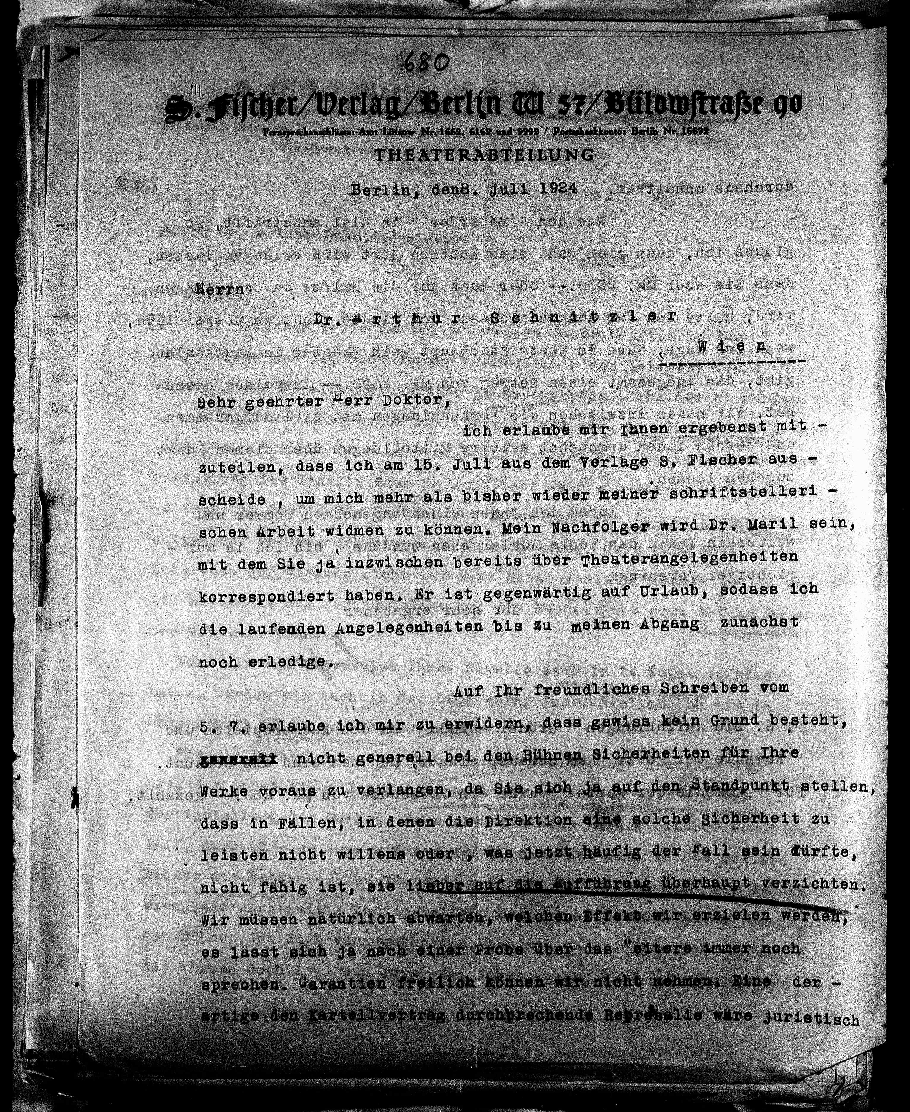 zuteilen, dass ich am 15. Juli aus dem Verlage S. Fischer aus -