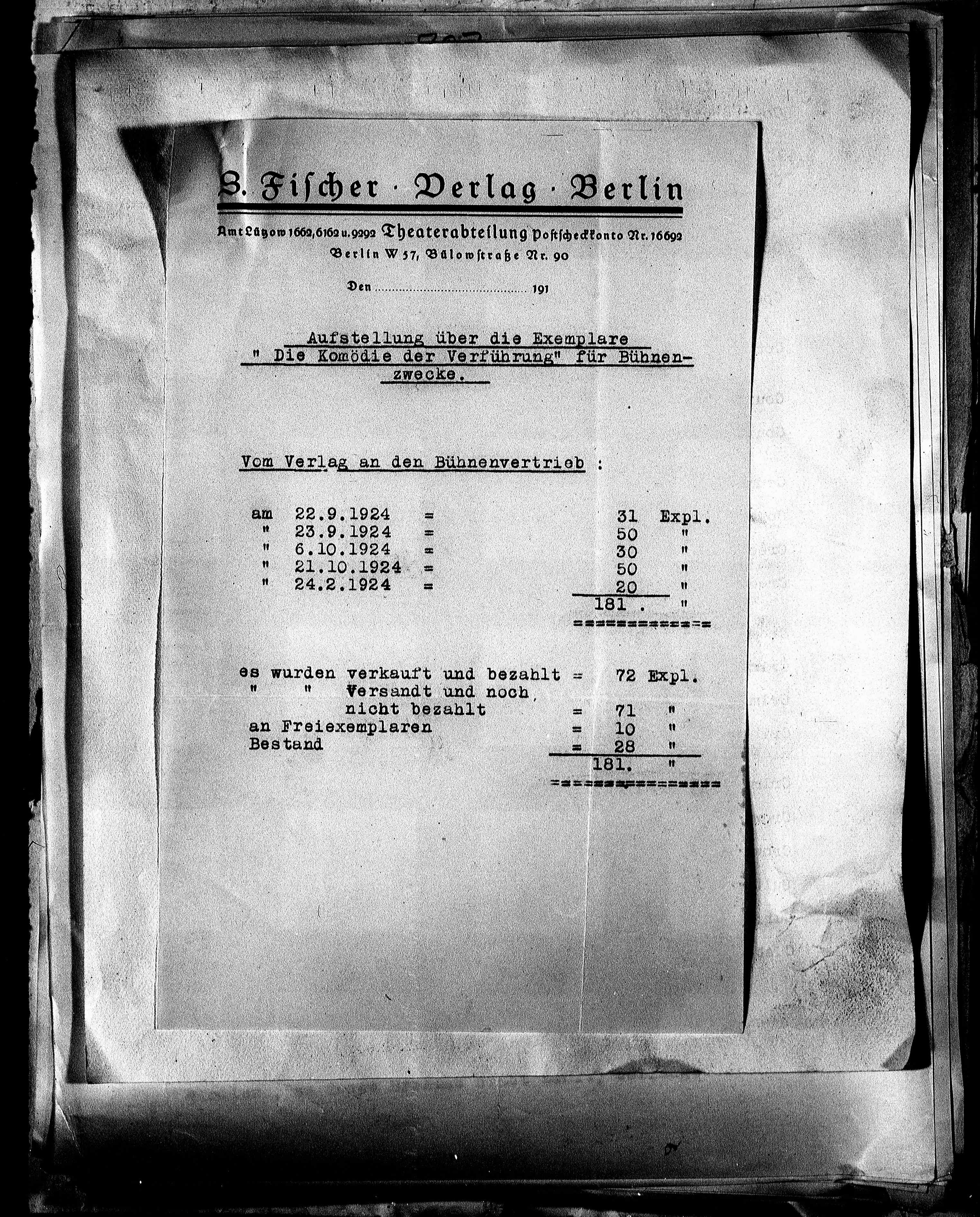 Amt Lützow 1662/6162 u. 9292 Theaterabteilung postscheckkonto Nr. 16692
