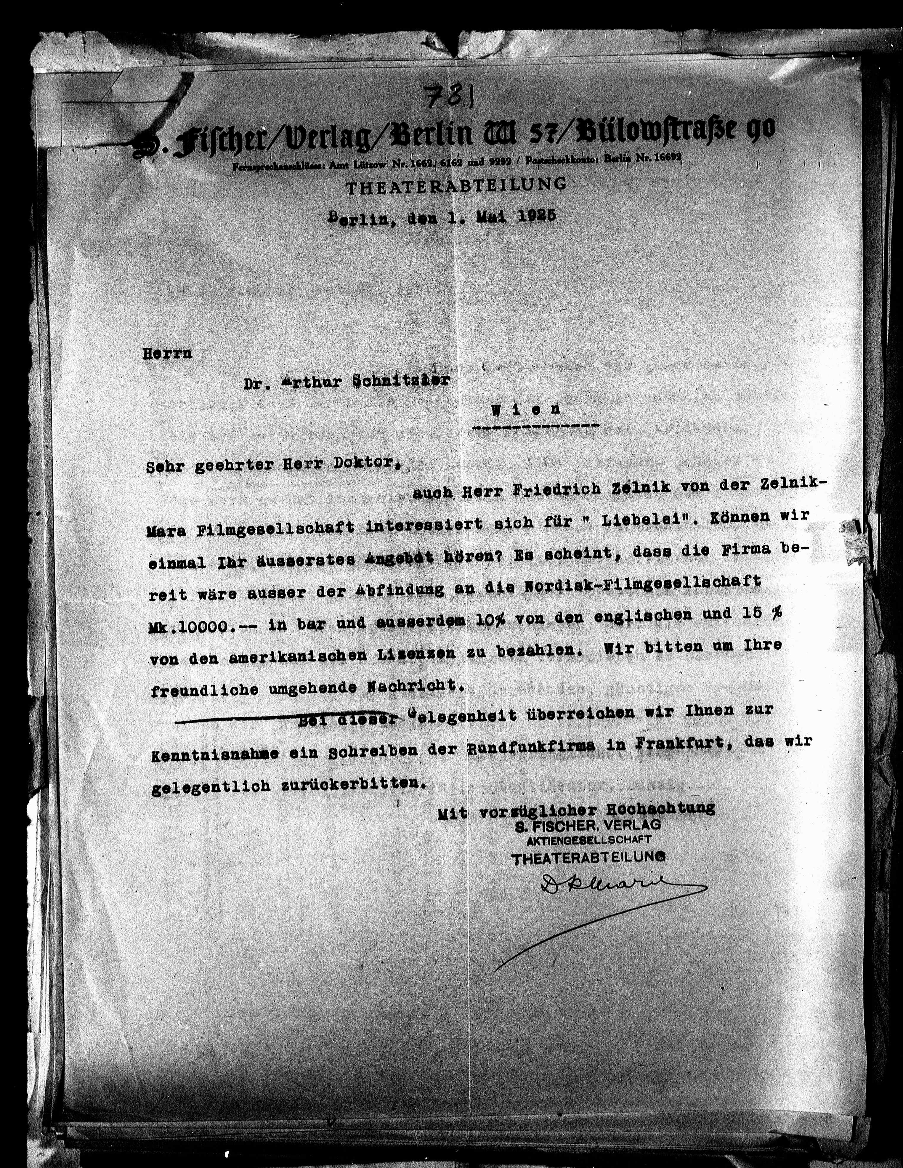 Kenntnisnahme ein Schreiben der Rundfunkfirma in Frankfurt, das wir