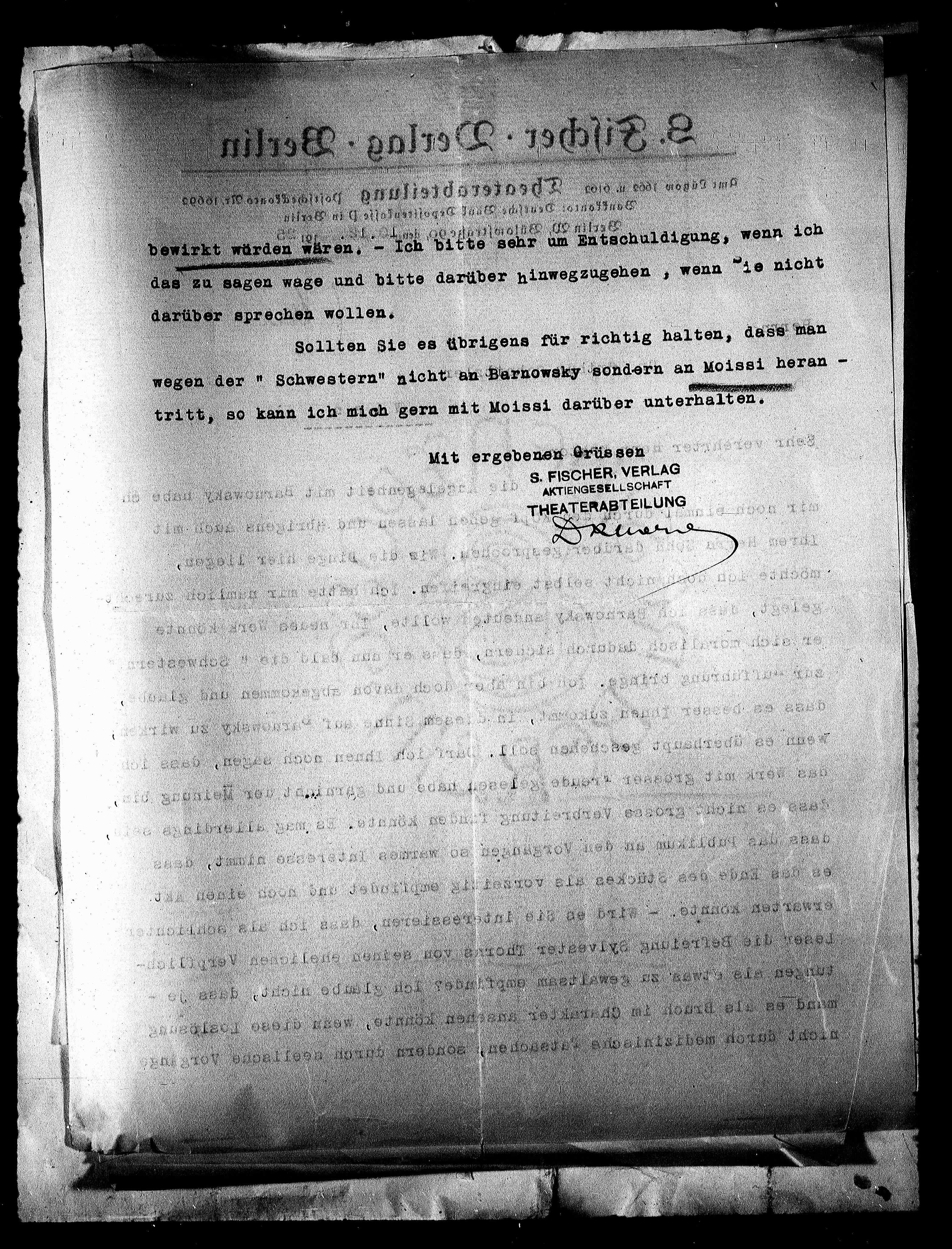 wegen der „Schwestern“ nicht an Barnowsky sondern an Moissi heran