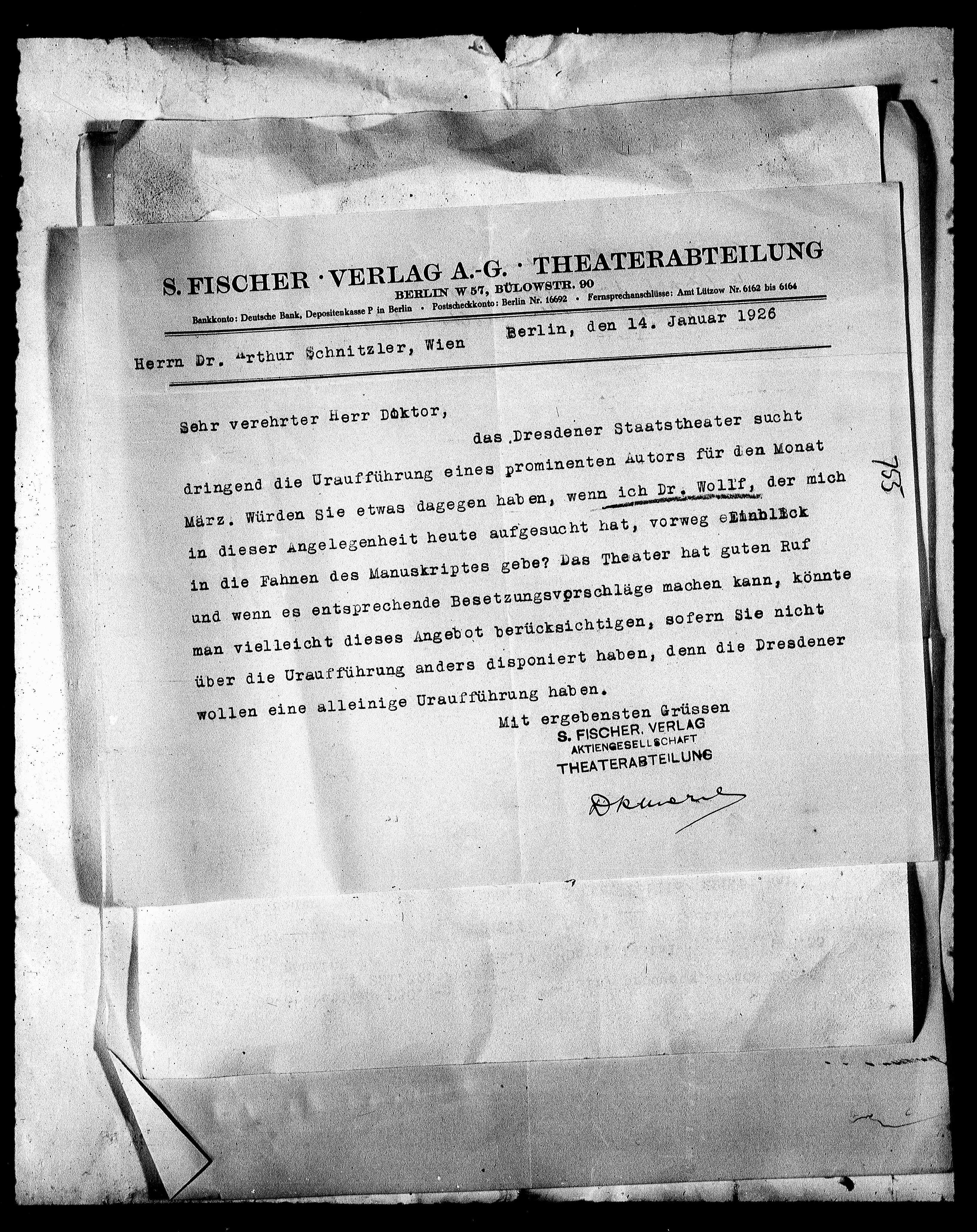 Herrn Dr. Arthur Schnitzler, Wien Berlin, den 14. Januaroc1926
