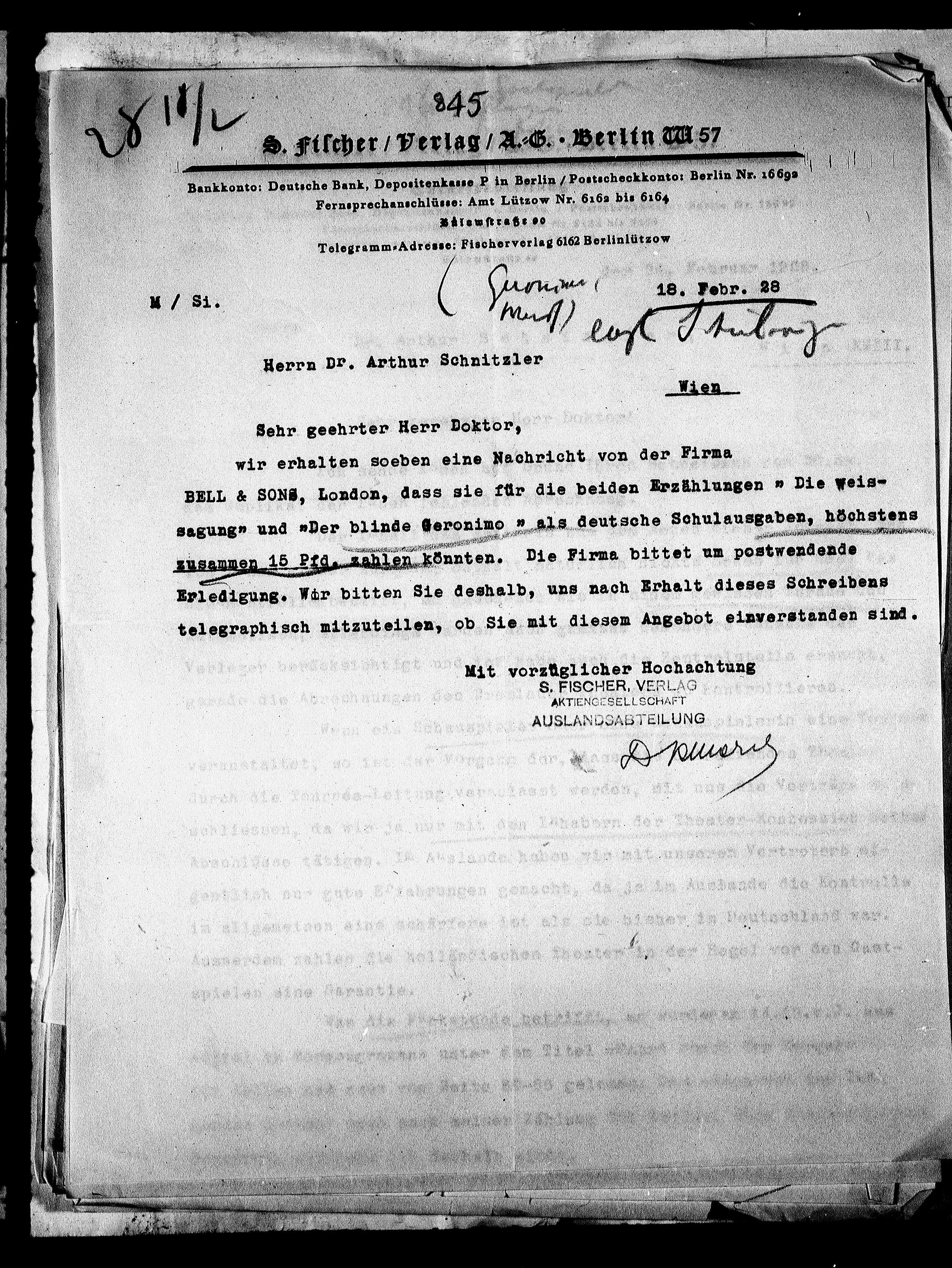 Telegramm=Adresse: Fischerverlag 6162 Berlinlützow