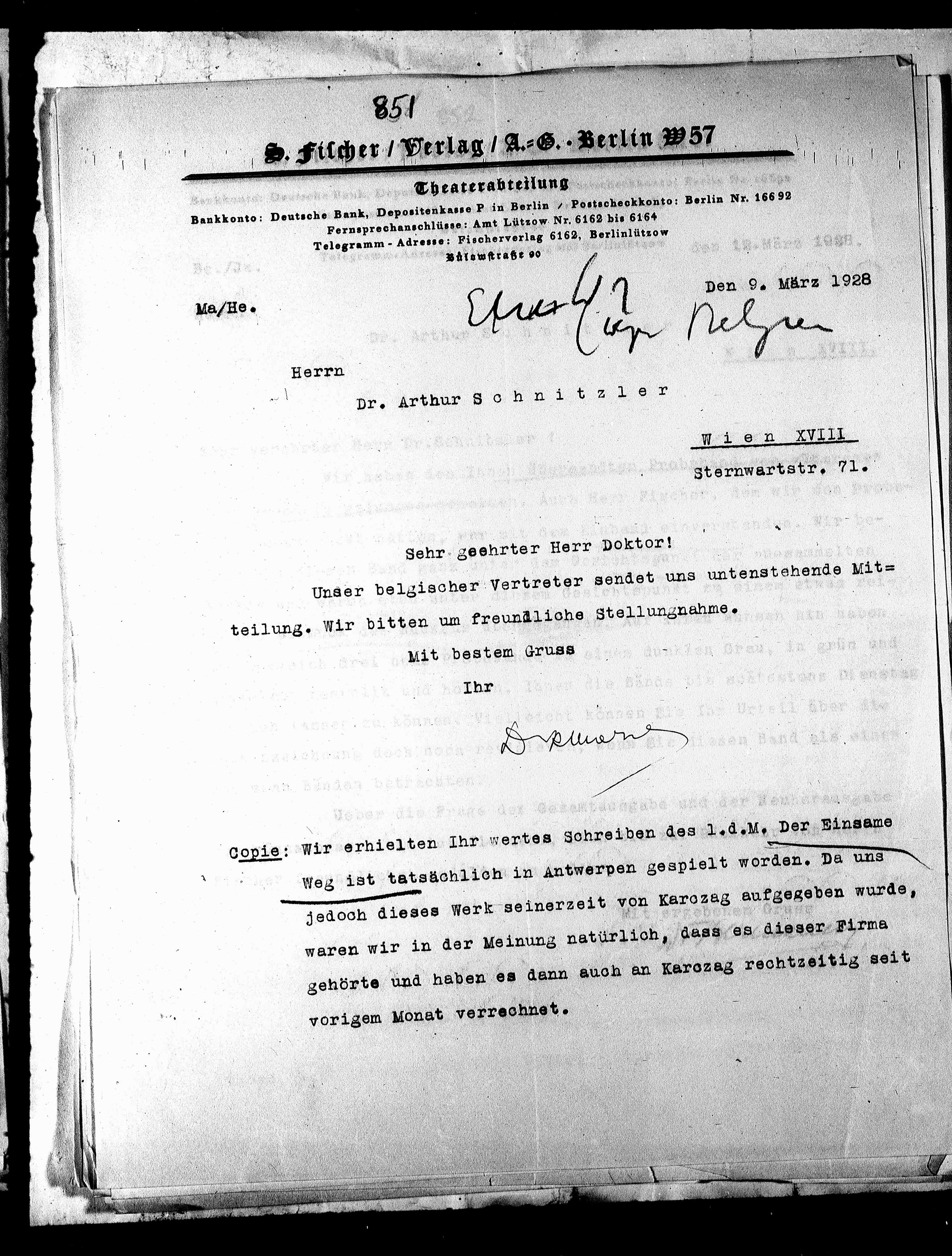 Copie: Wir erhielten Ihr wertes Schreiben des 1.d.M. Der Einsame
