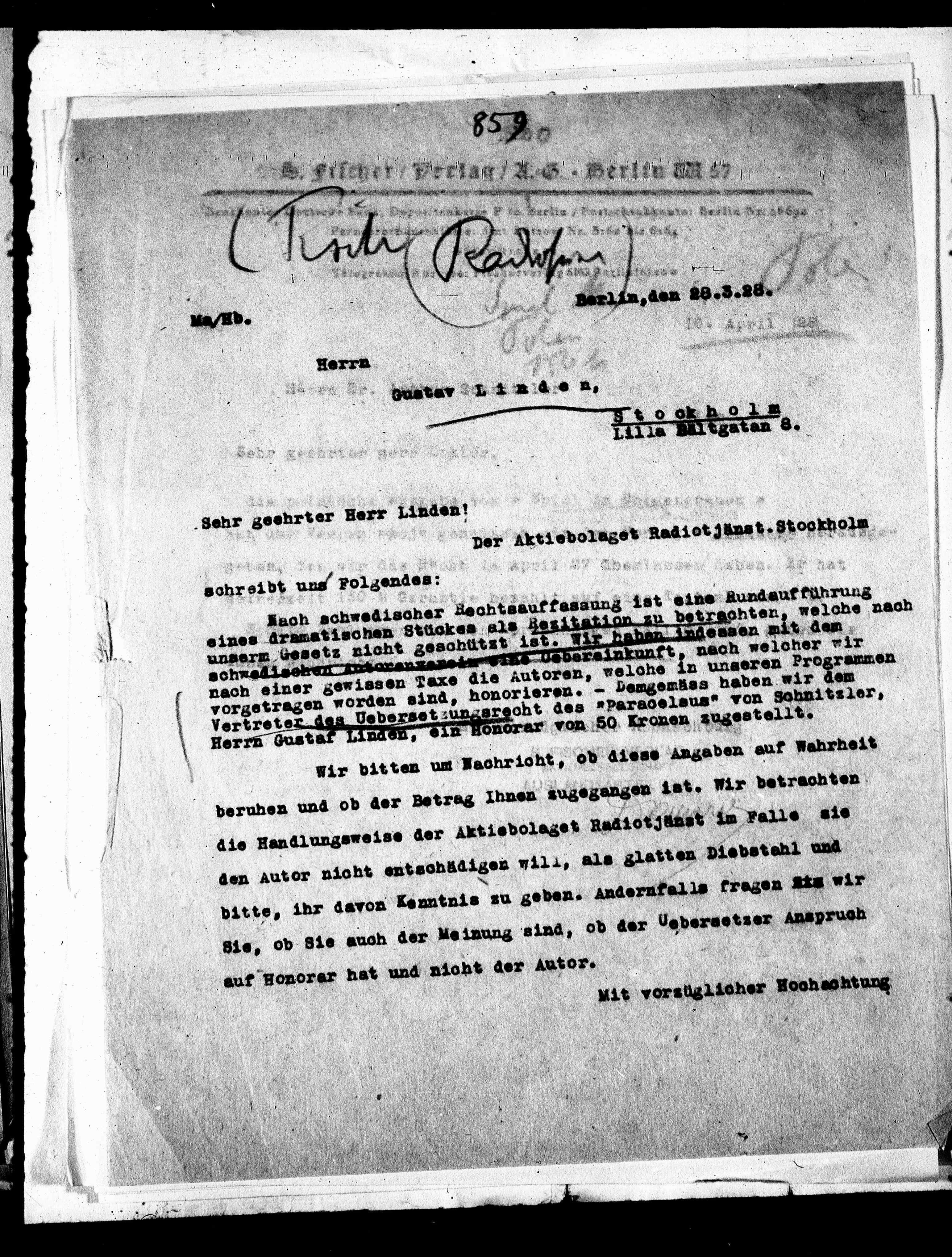 Vertreter des Uebersetzungsrecht des „paracelsus“ von Schnitzler,