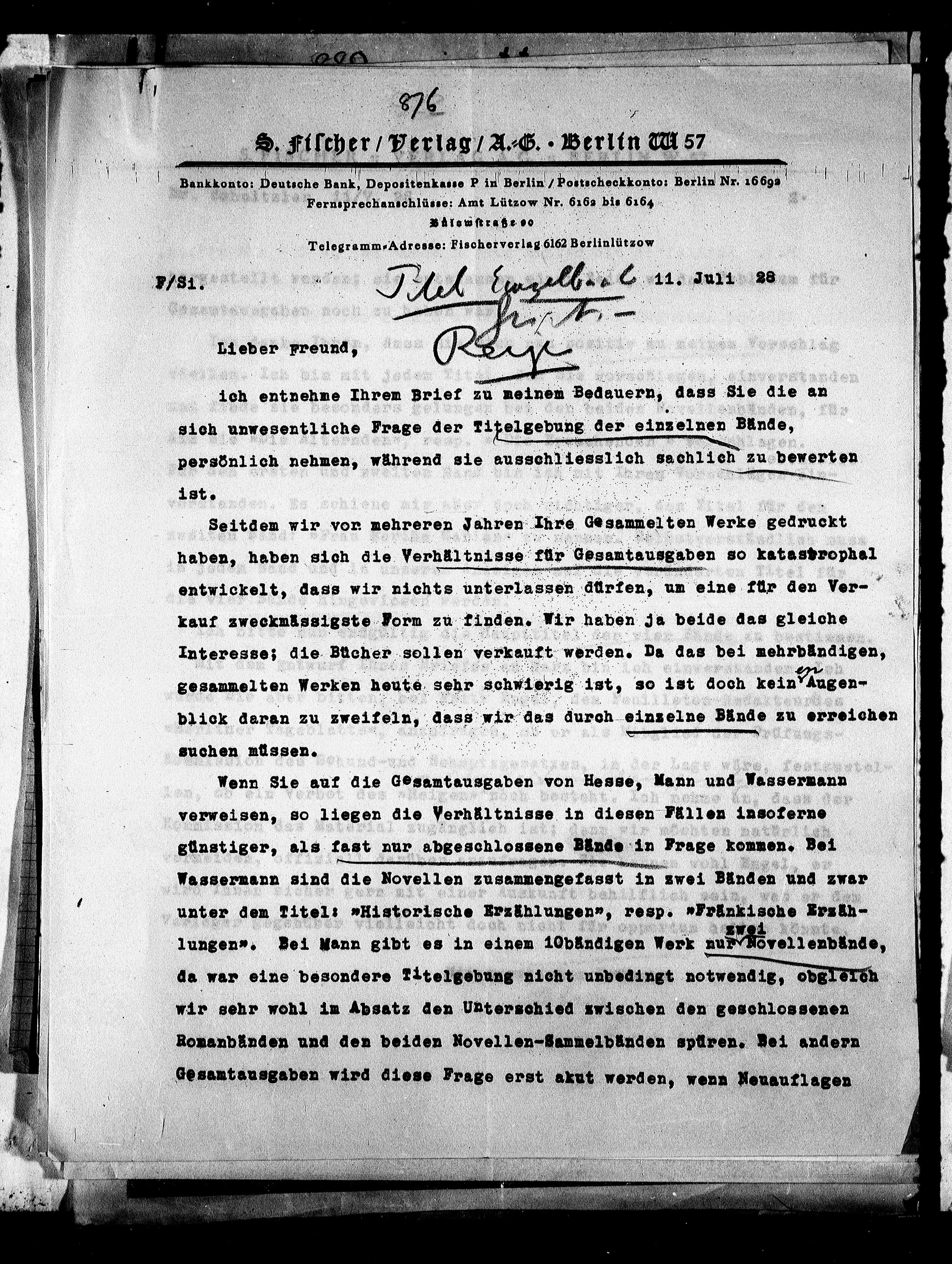 Telegramm.Adresse: Fischerverlag 6162 Berlinlützow