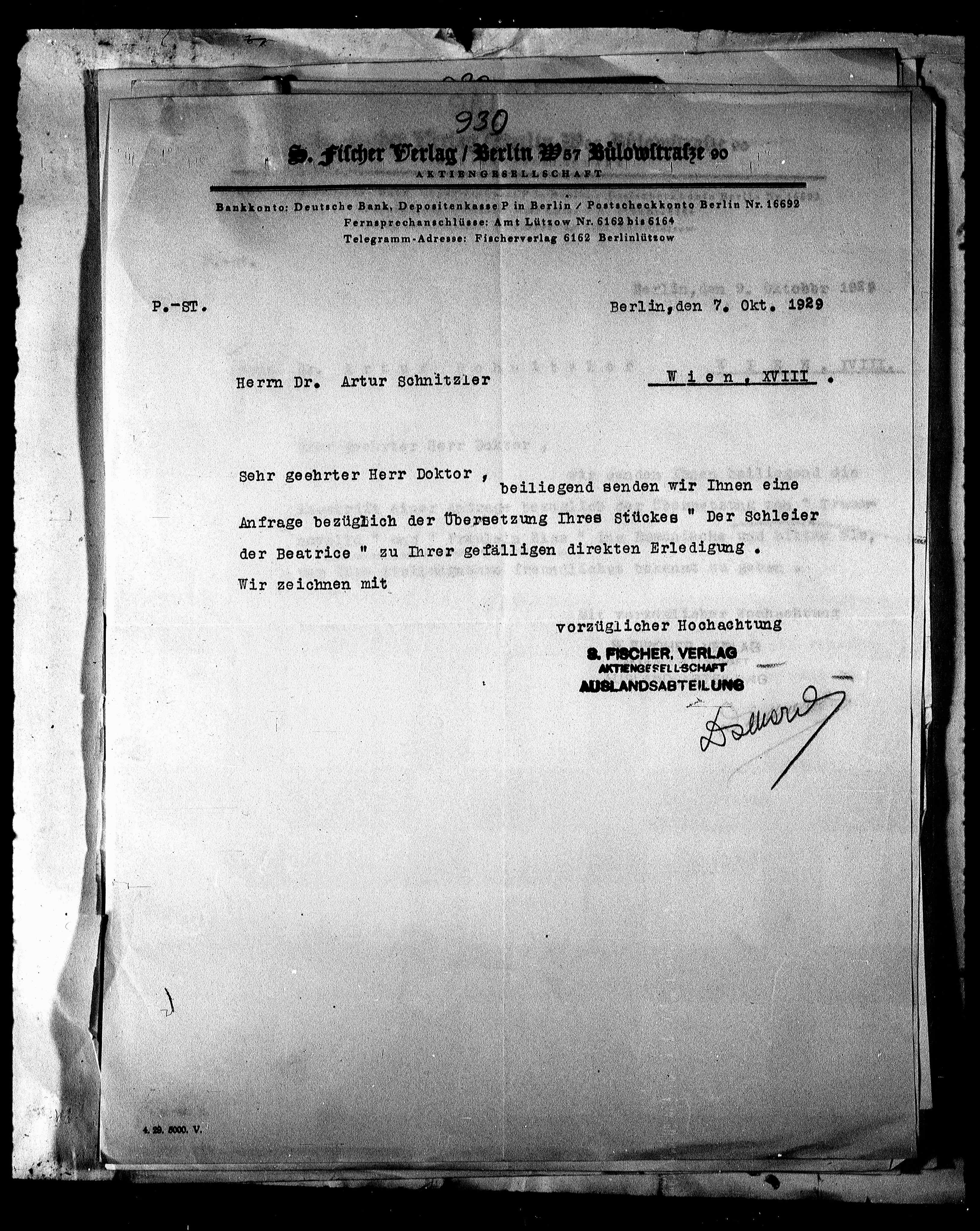 Anfrage bezüglich der Übersetzung Ihres Stückes.“ Der Schleier