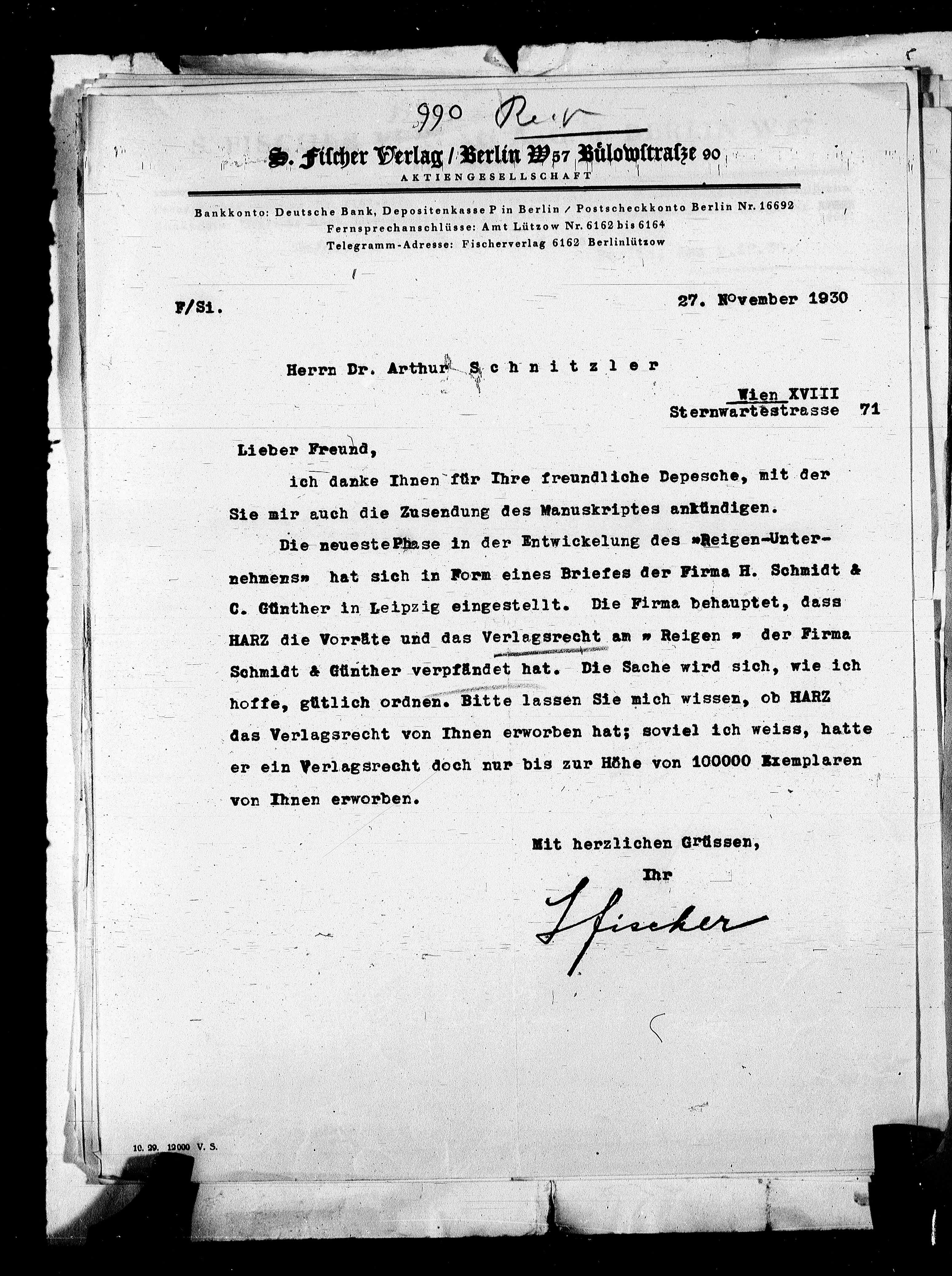 Telegramm-Adresse: Fischerverlag 6162 Berlinlützow