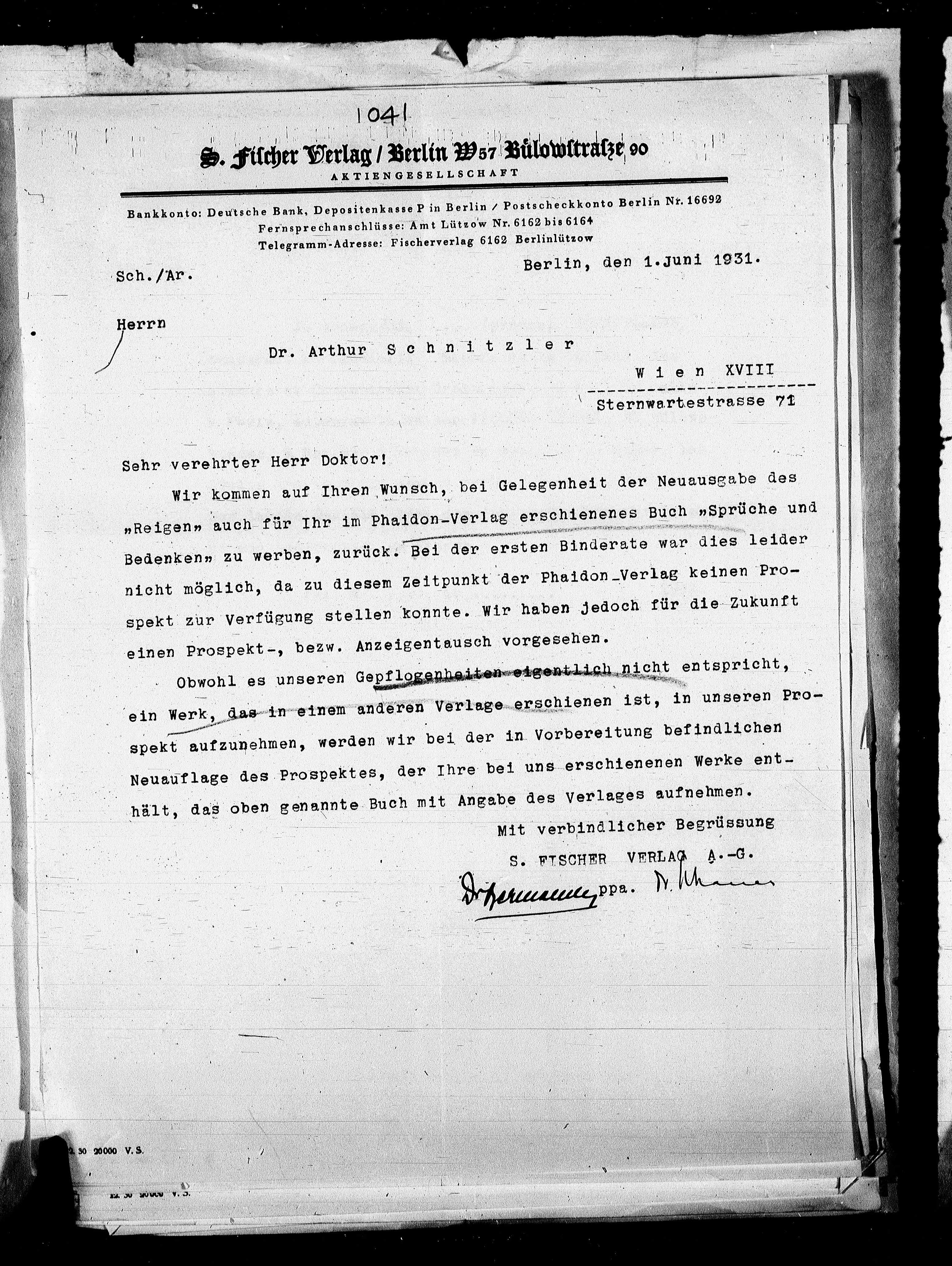 Telegramm-Adresse: Fischerverlag 6162 Berlinlützow