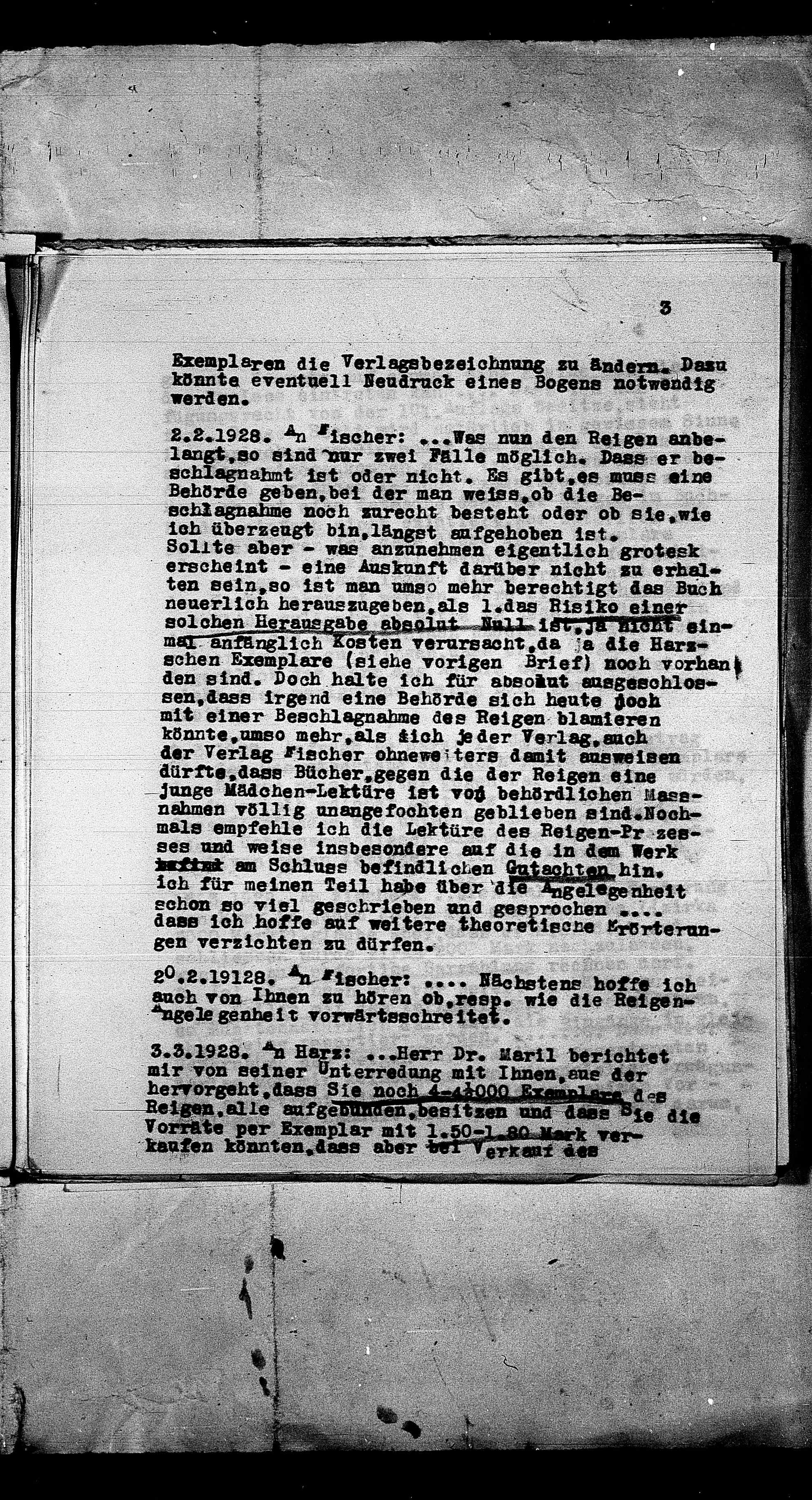 2.2.1928. An Fischer:...Was nun den Reigen anbe-