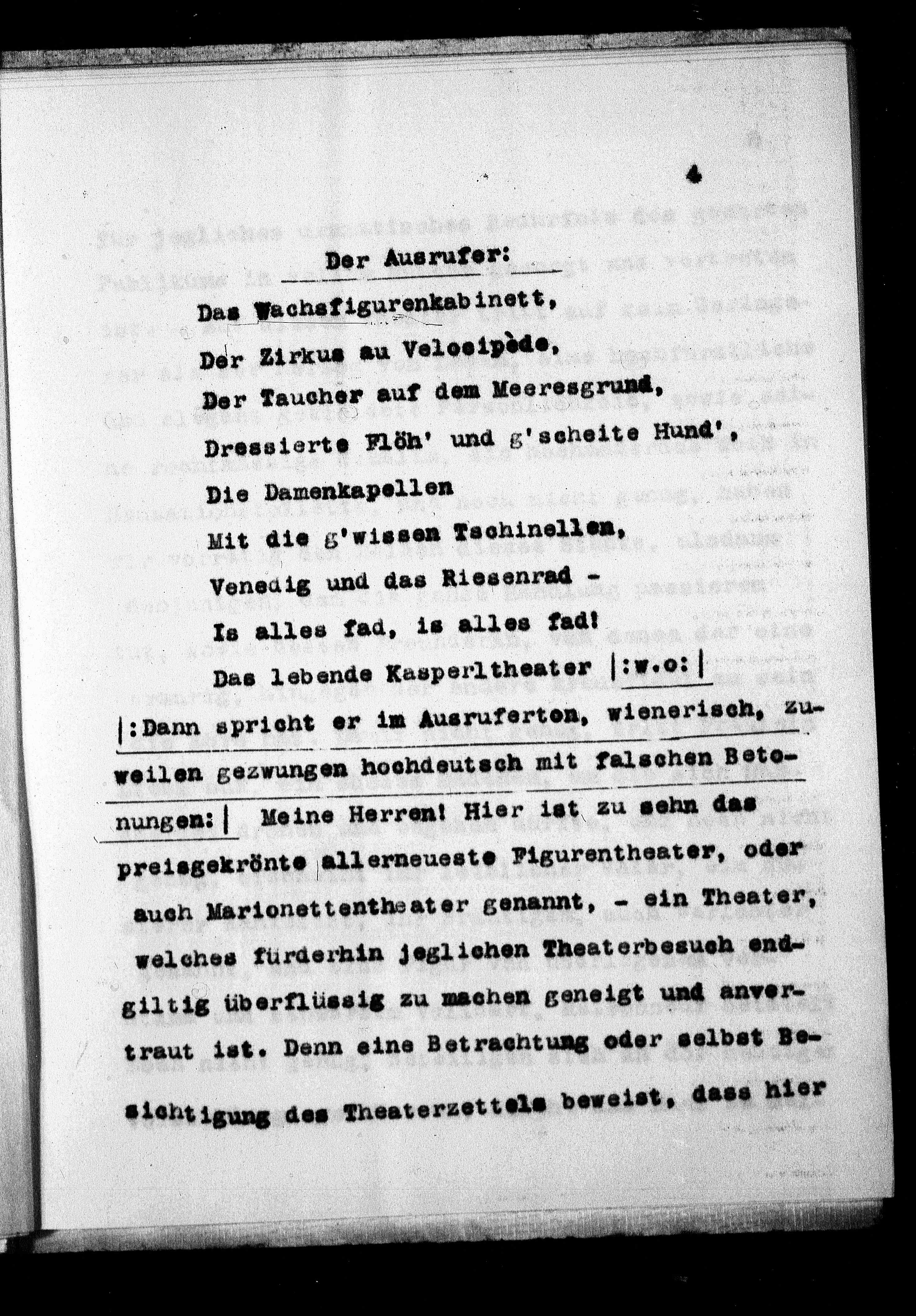 :Dann spricht er im Ausruferten, wienerisch, zu-