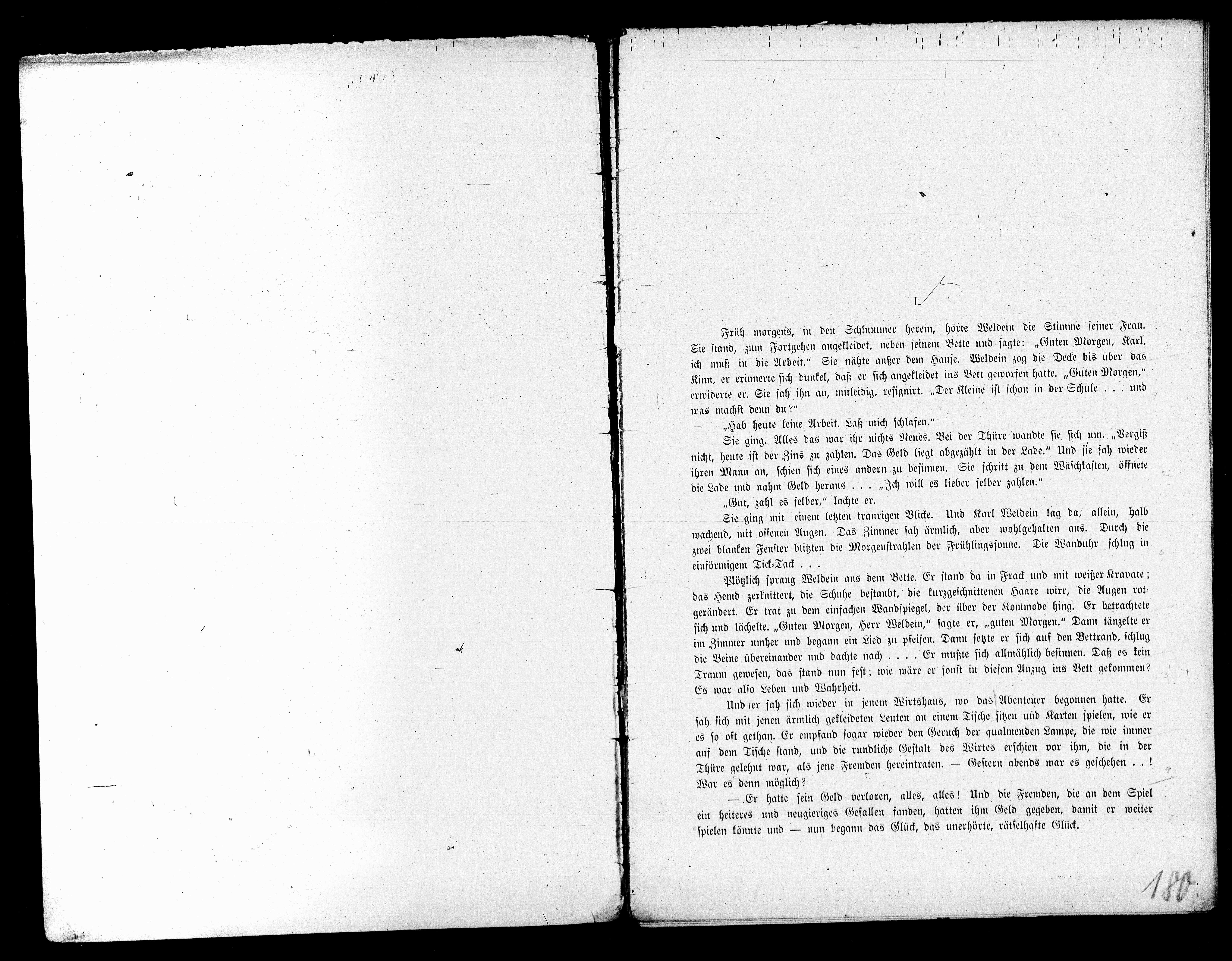 Plötzlich sprang Weldein ans dem Bette. Er stand da in Frack und mit weißer Kravate;