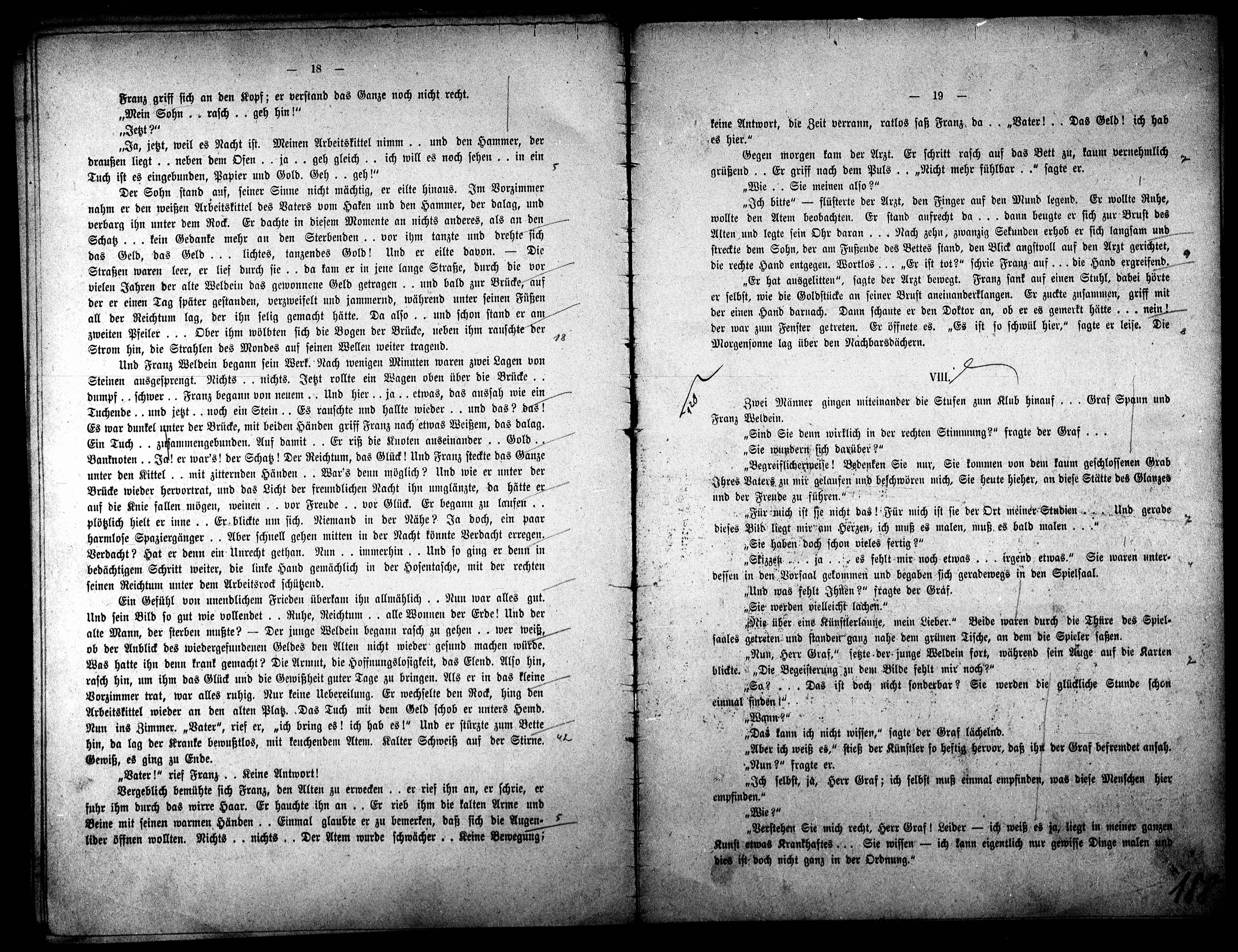 „Nun, Herr Graf." setzte der junge Weldein fort, während sein Auge auf die Karten