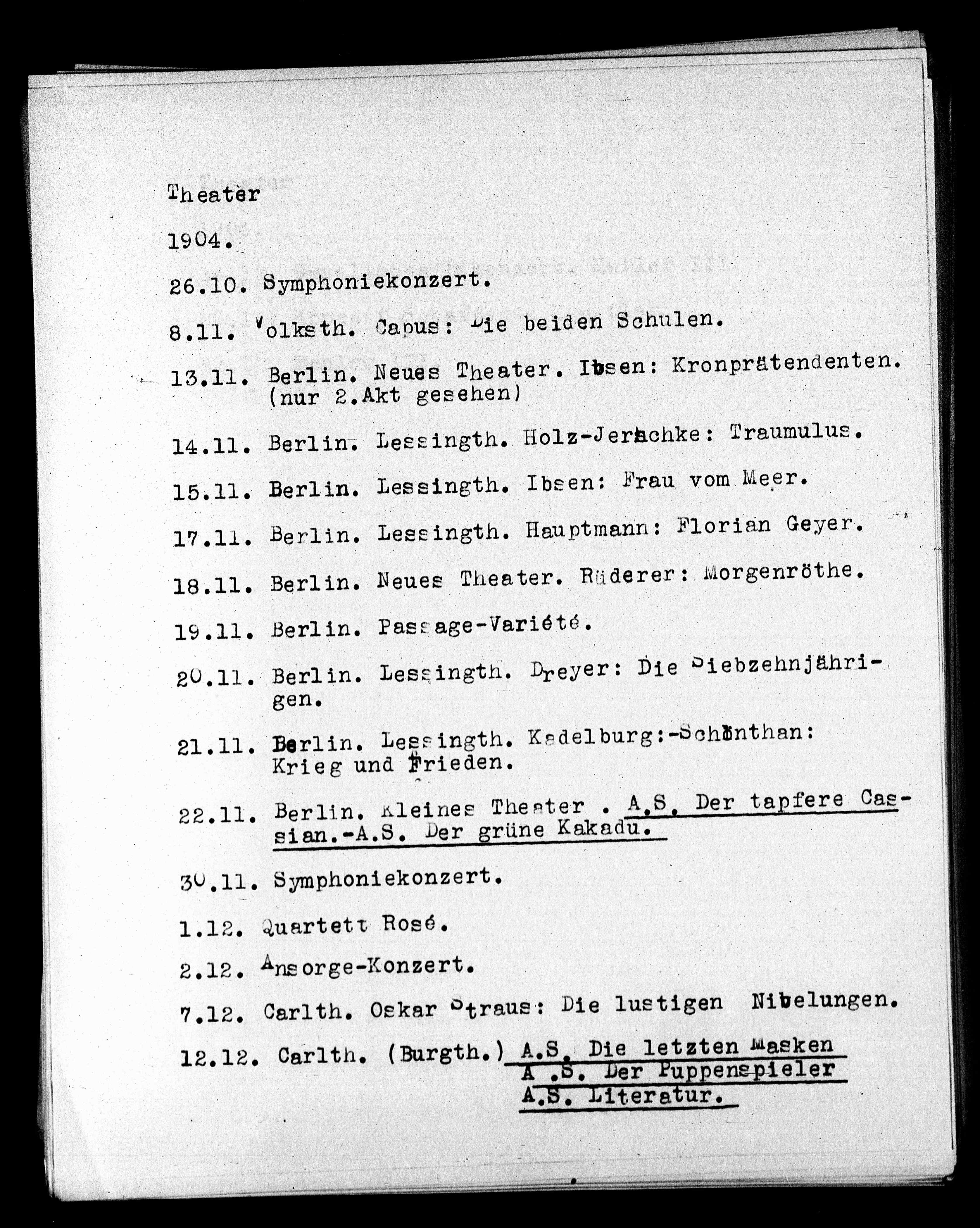 22.11. Berlin, Kleines Theater. A.S. Der tapfere Cas