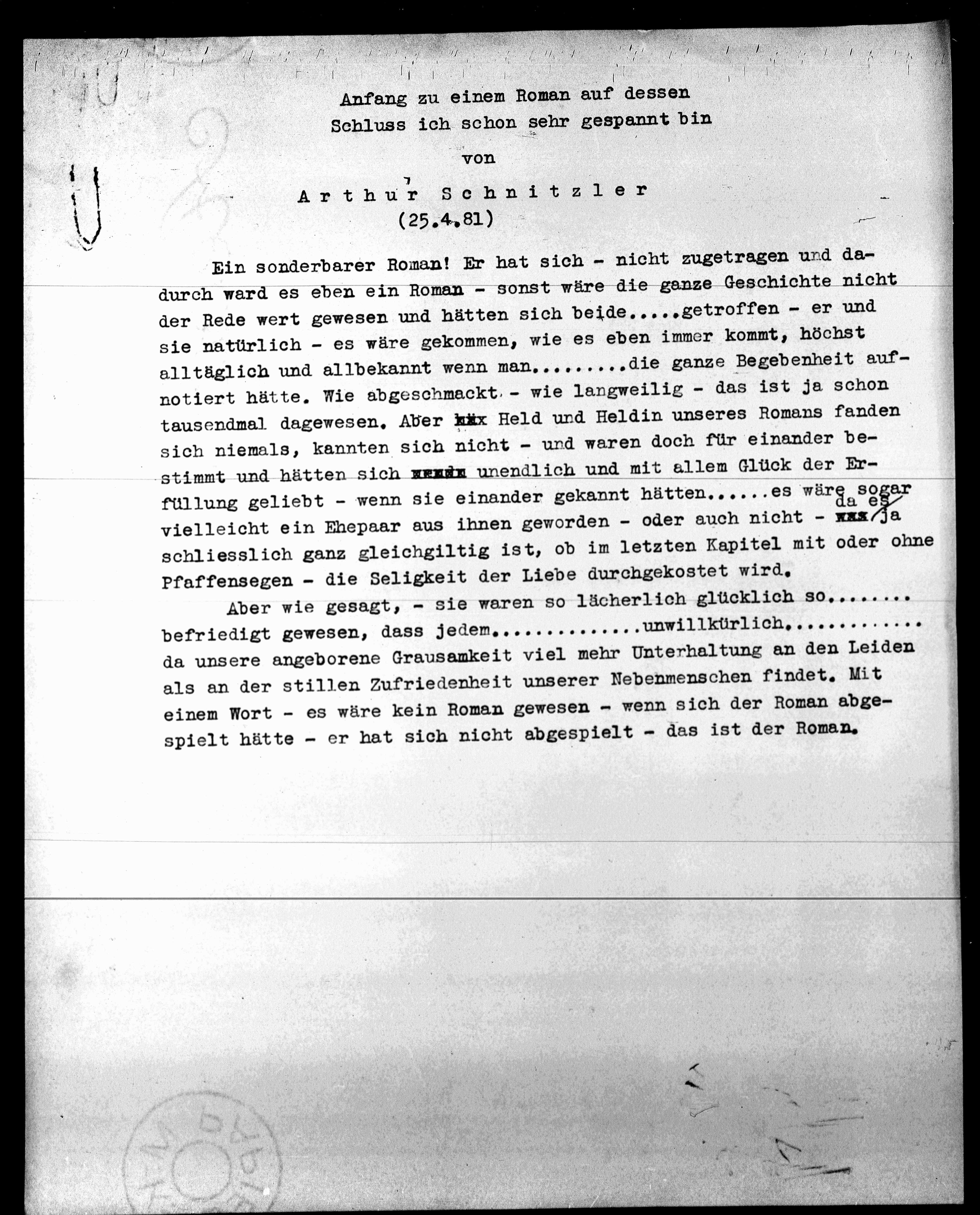 Anfang zu einem Roman auf dessen
