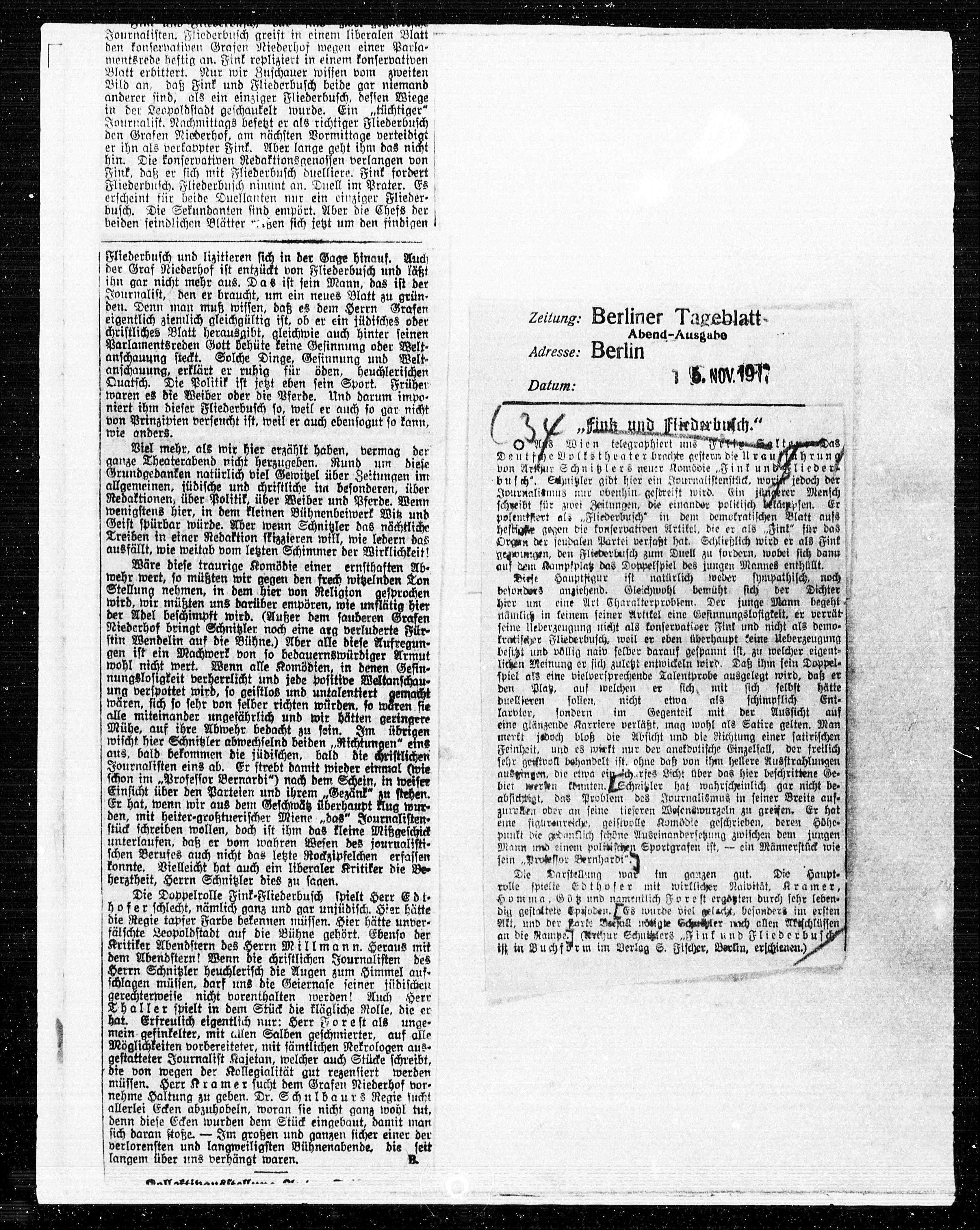 von Arthur Schnitzlers neuer Komödie „Fink und Klieders