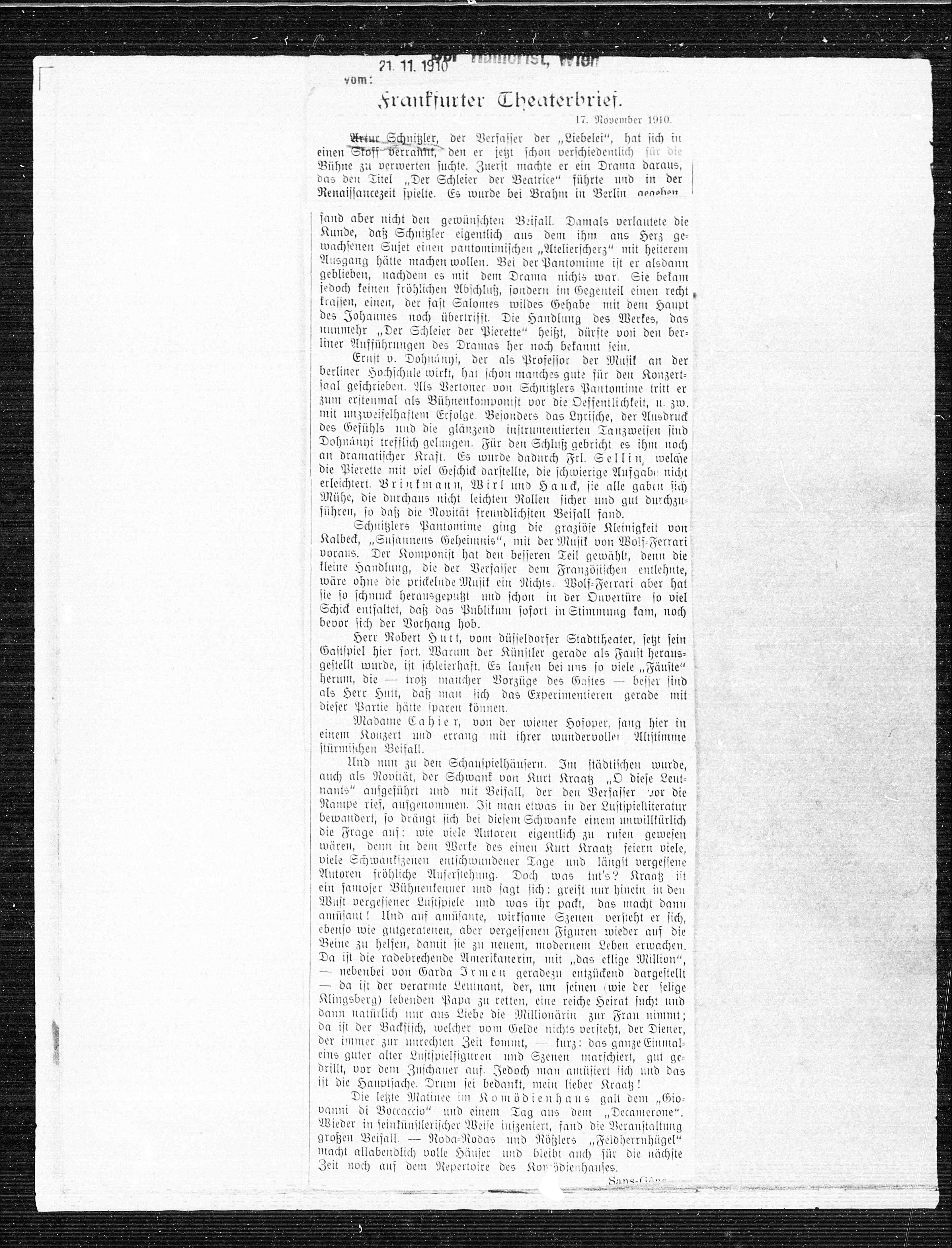 Kalbeck, „Susannens Geheimnis“ mit der Musik von Wolf=Ferrari