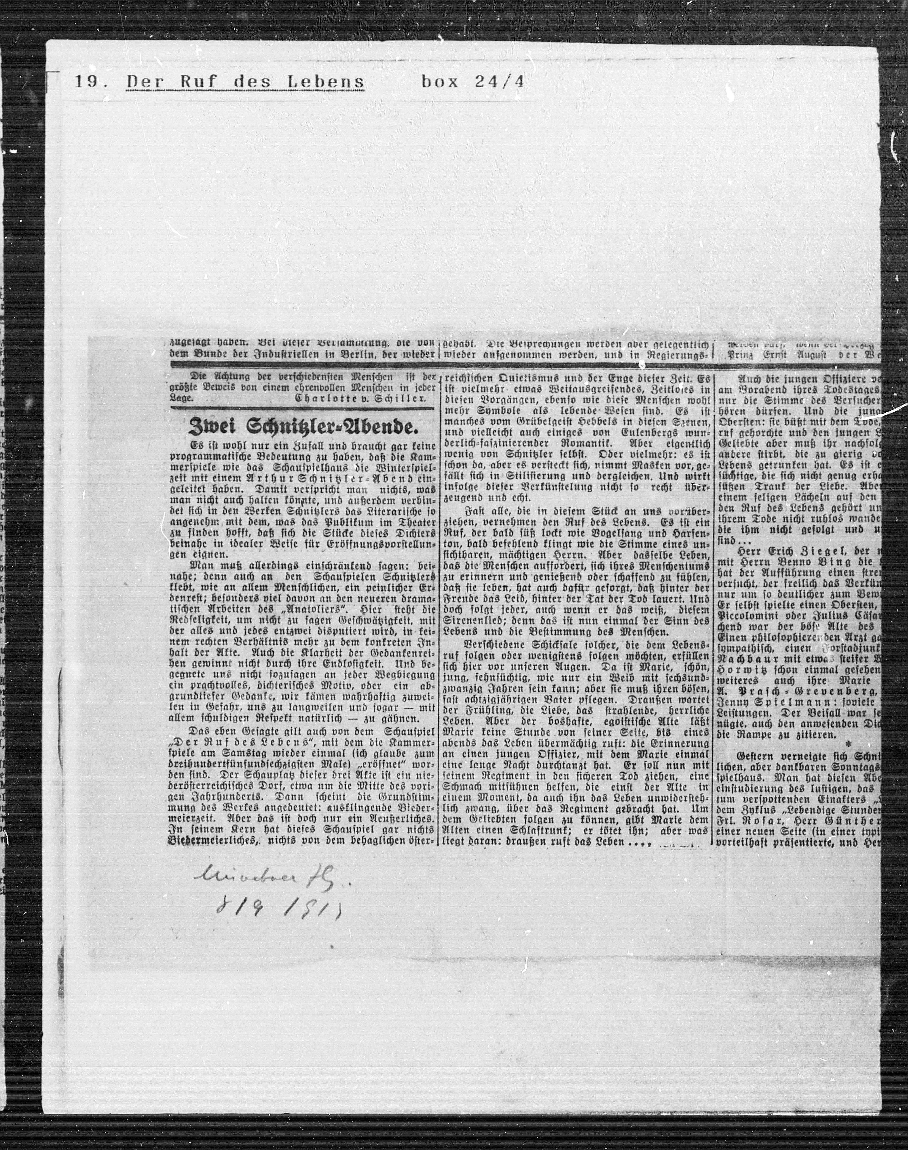 zeit mit einem Arthur Schnitzler=Abend ein= fällt sich in Stilisierung und dergleichen. Und wirkt