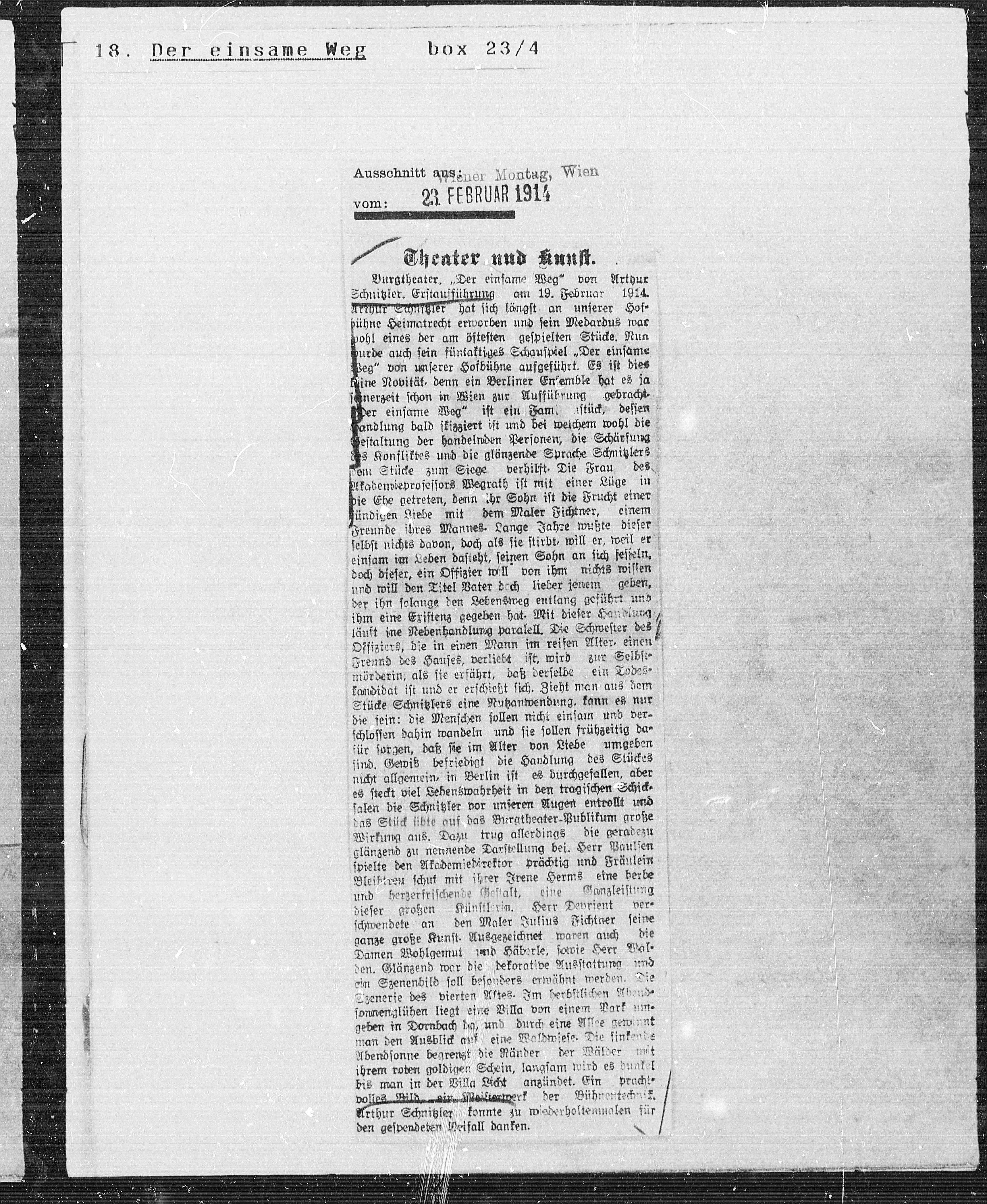 Schnitzler. Erstaufführung am 19. Februar 1914.