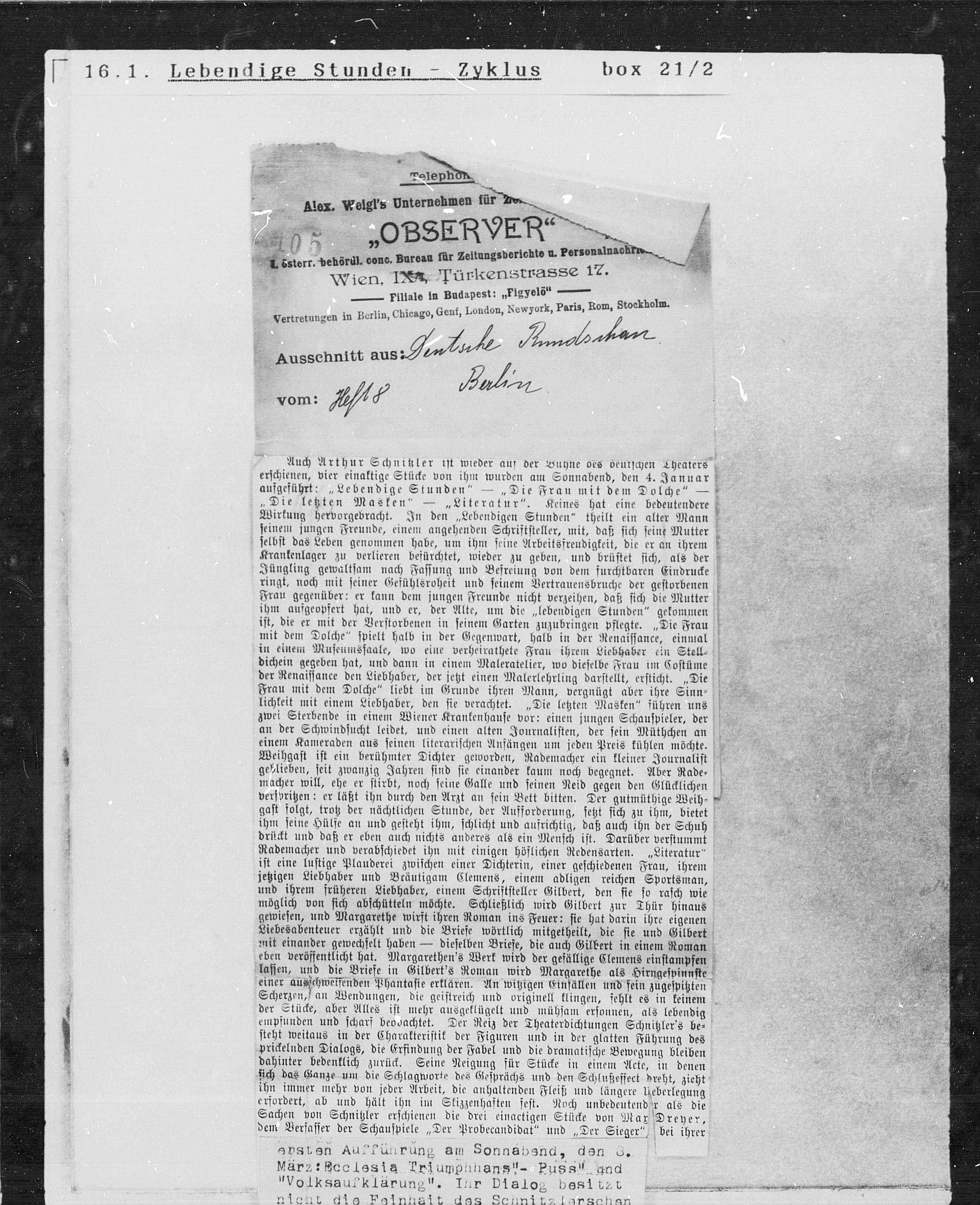 aufgeführt: „Lebendige Stunden“ — „Die Frau mit dem Dolche“ —
