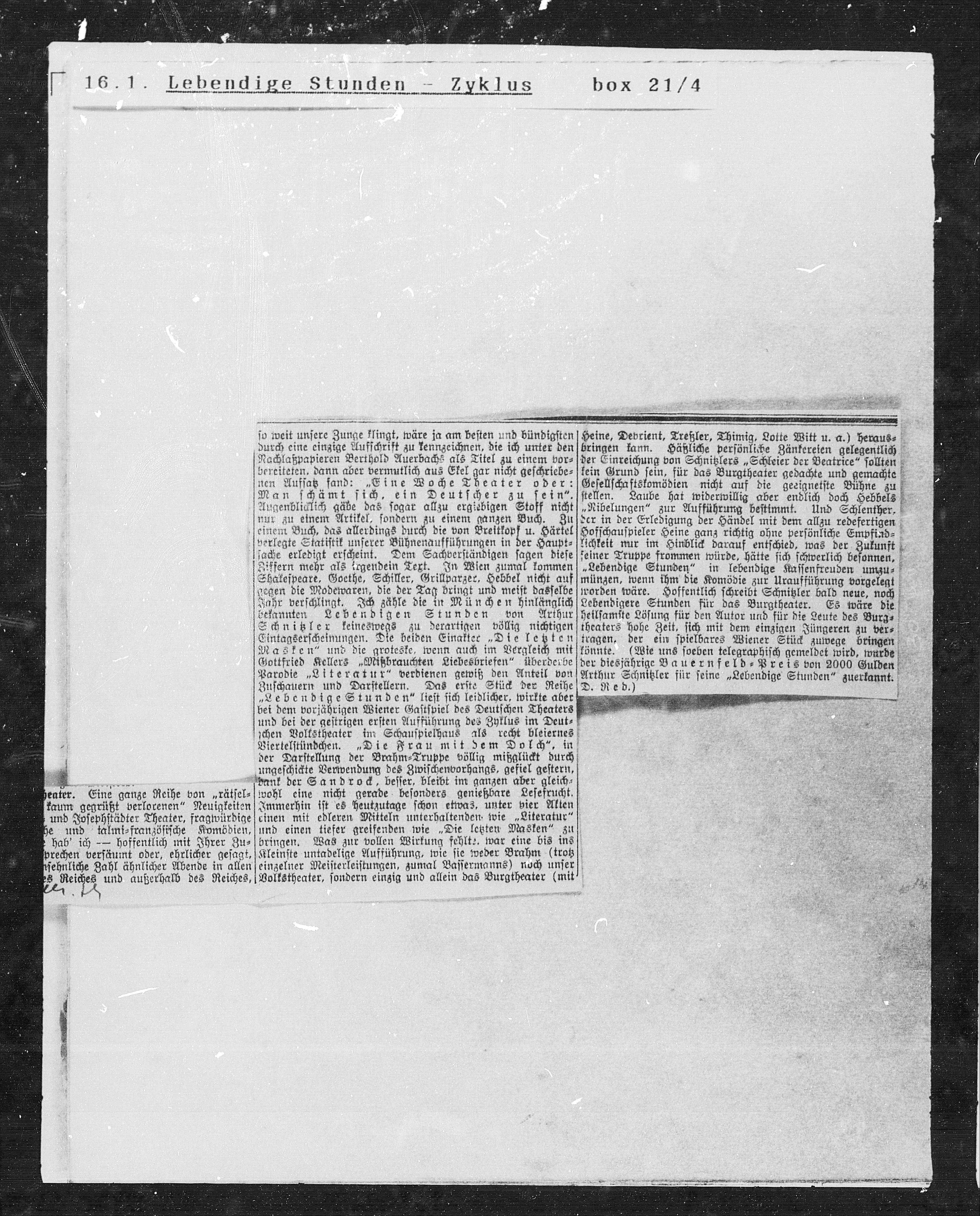 Parodie „Literatur“ verdienen gewiß den Anteil von Arthur Schnitzler für seine „Lebendige Stunden“ zuerkannt.