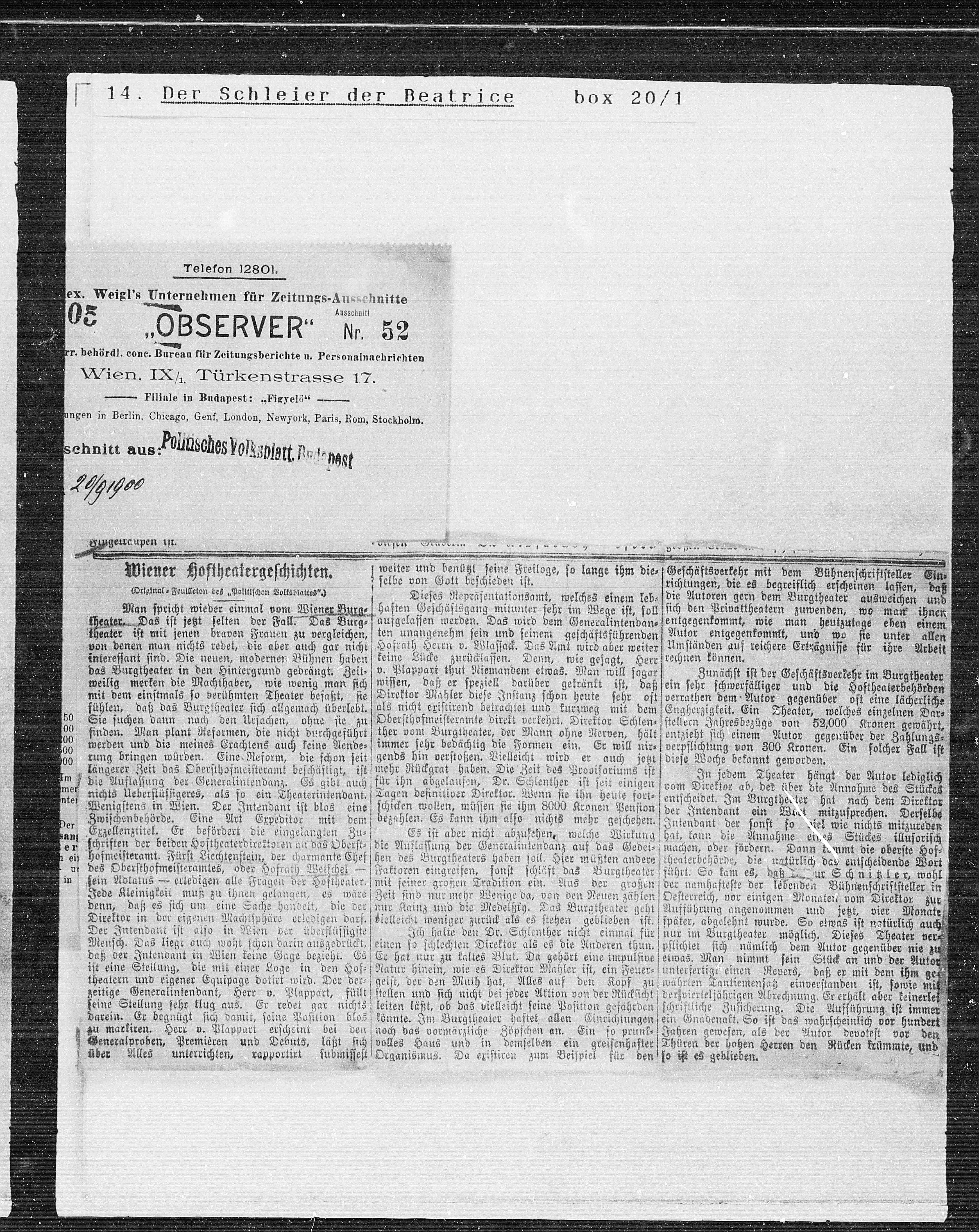 ex. Weigl’s Unternehmen für Zeitungs-Ausschnitte