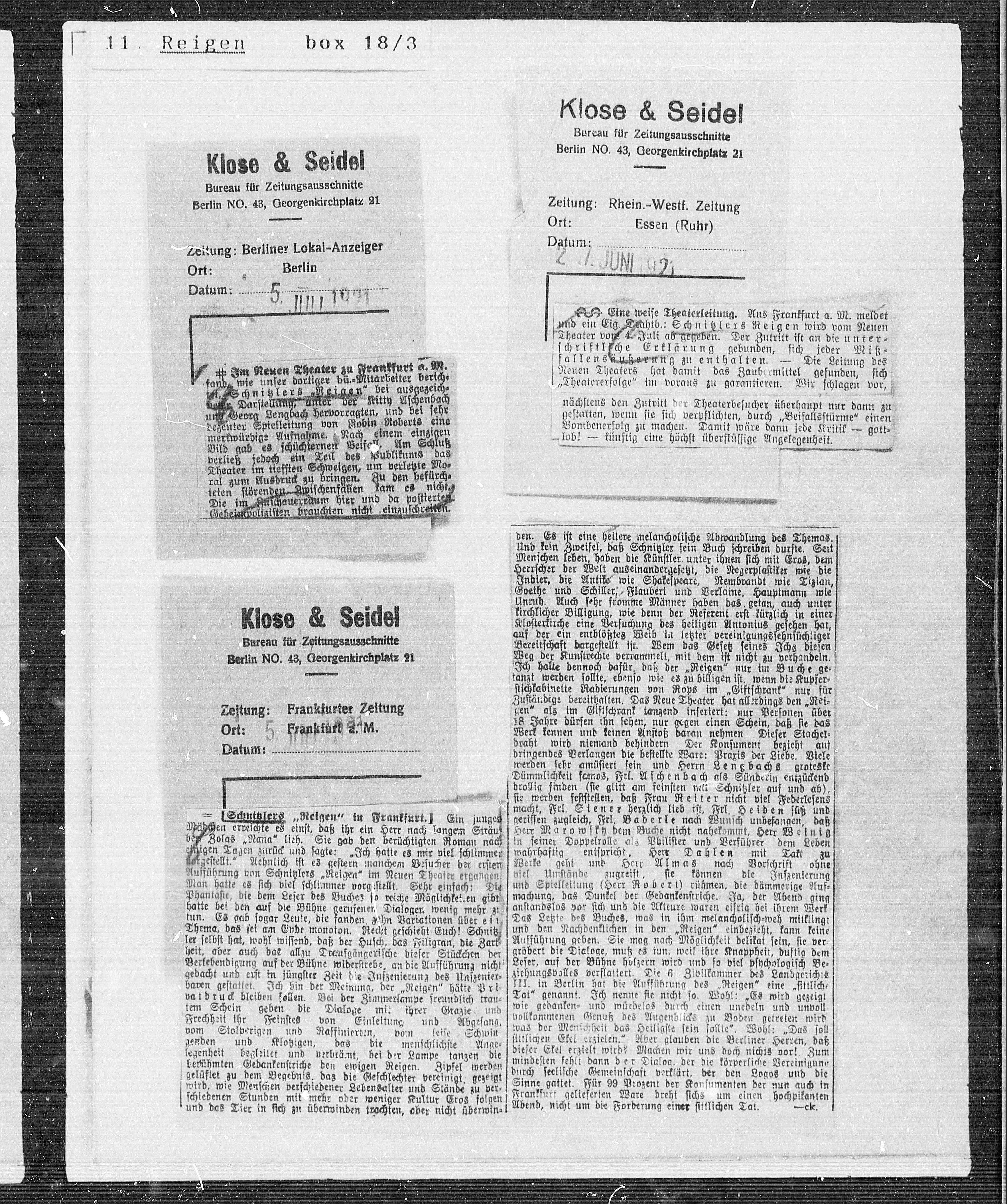 Schuitzlers „Reigen“ in Frankfurt.] Ein junges