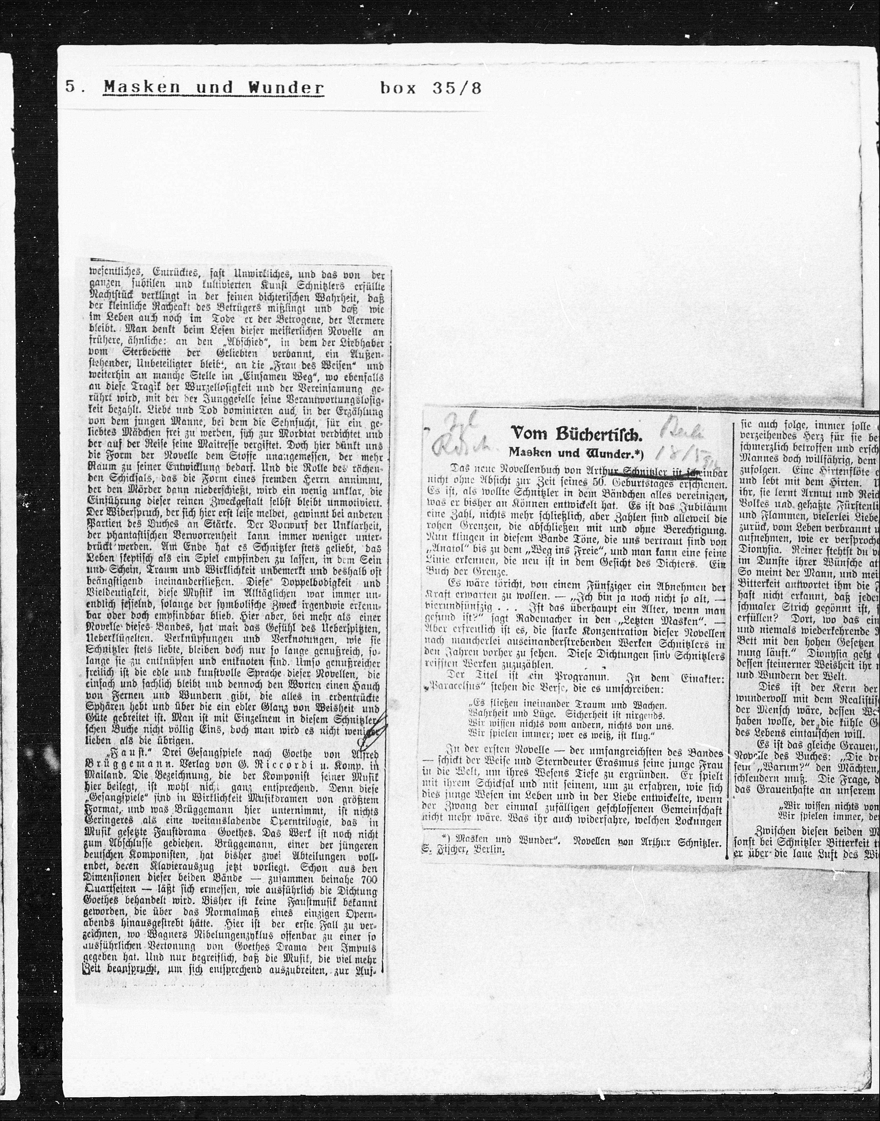 *) Masken und Wunder“. Novellen von Arthur Schnitzler. sonst bei Schnitzler Bitterkeitt